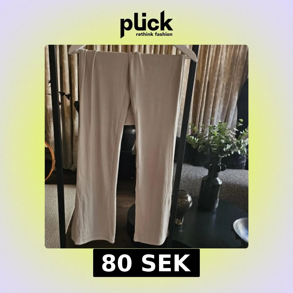 Säljer ett par beige ribbade mjukisbyxor med wide fit. Byxorna har en mjuk och stretchig känsla, perfekta för chill dagar. De är helfärgade och har en snygg, enkel look som passar till allt. Supersköna och lätta att matcha med hoodies eller t-shirts. Byxorna har även slitsar längst ned som man kan se på sista bilden.