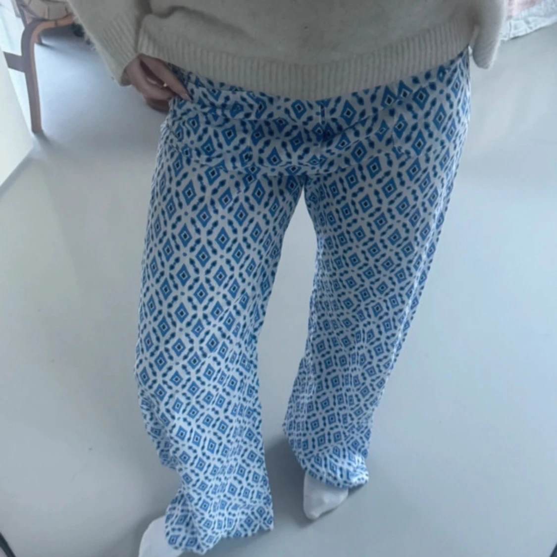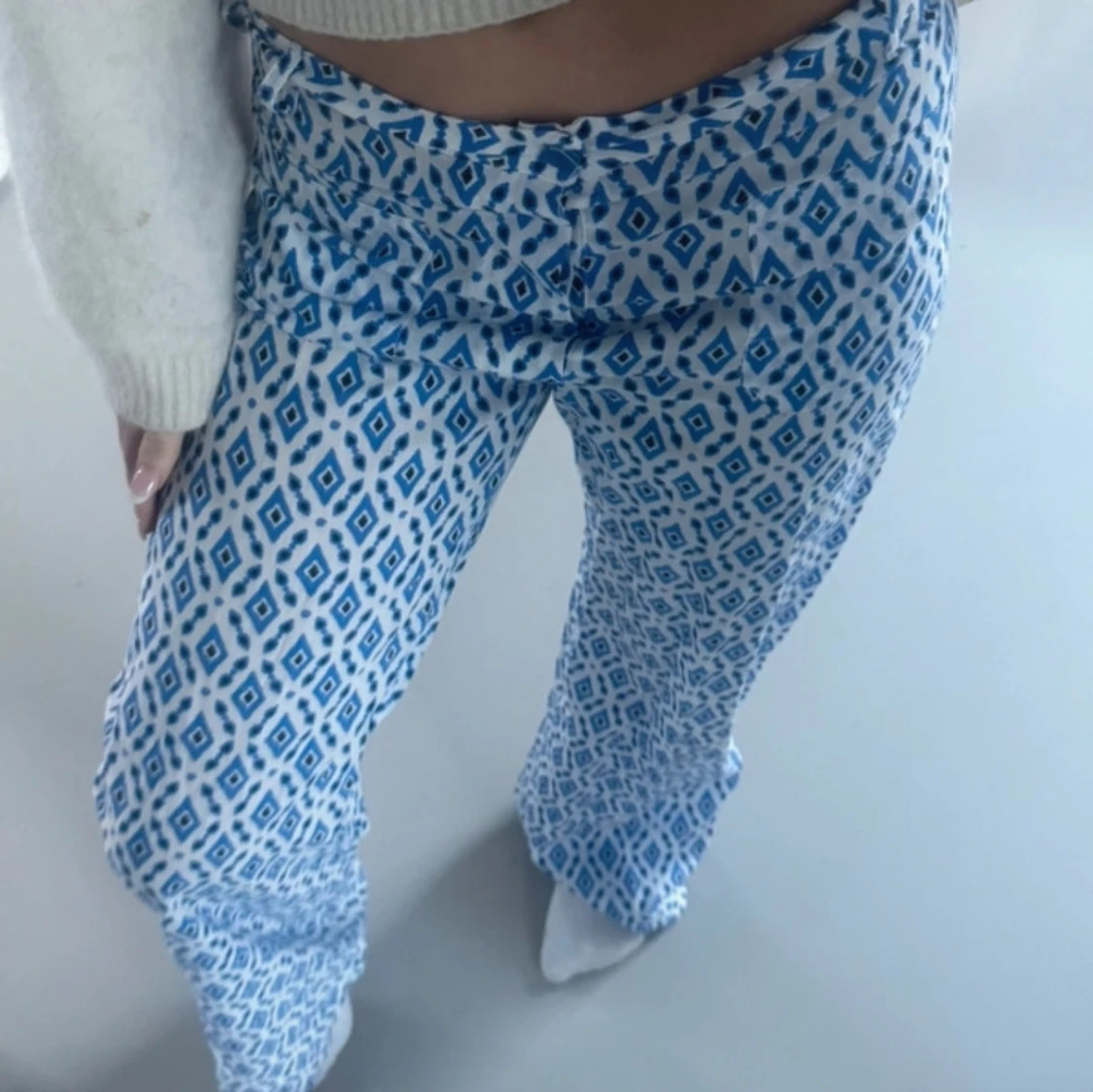 Snygga byxor med blått och vitt mönster. De har en loose passform och är perfekta för en avslappnad stil. Köpta på Zara för längesedan men kommer ej till användning.