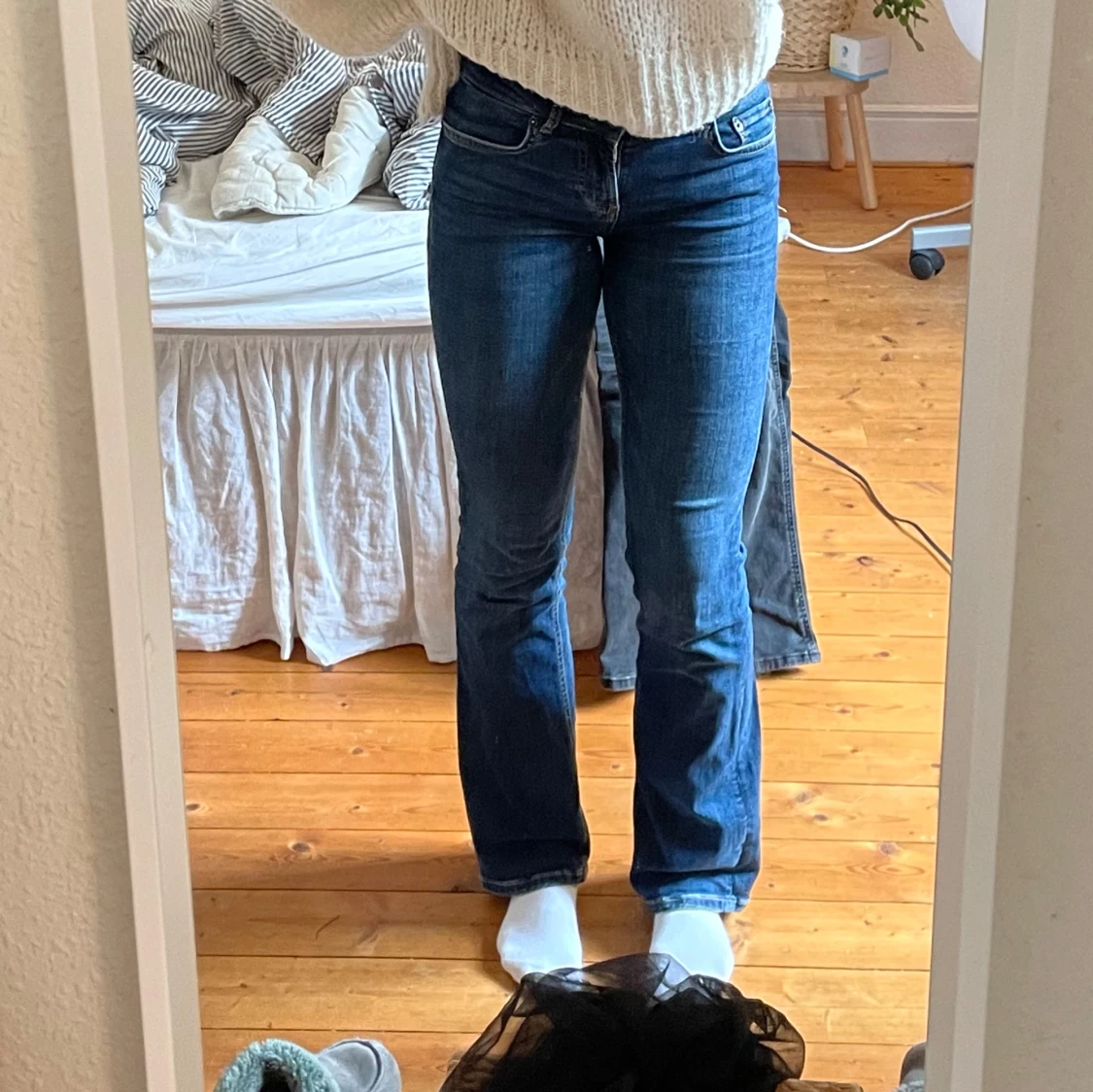 Säljer ett par klassiska blå bootcut jeans med normal passform. Jeansen har fem fickor, dragkedja och knapp framtill. Perfekta till vardags och lätta att matcha med olika toppar.