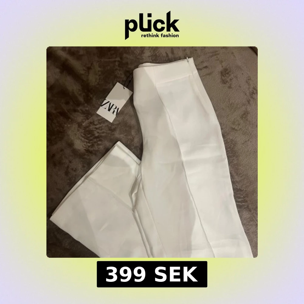 Snygga vita kostymbyxor från Zara med en elegant och stilren design. Byxorna har en rak passform och är helt nya och oanvända. Lappen är kvar! Säljer på grund av fel storlek för mig tyvärr.