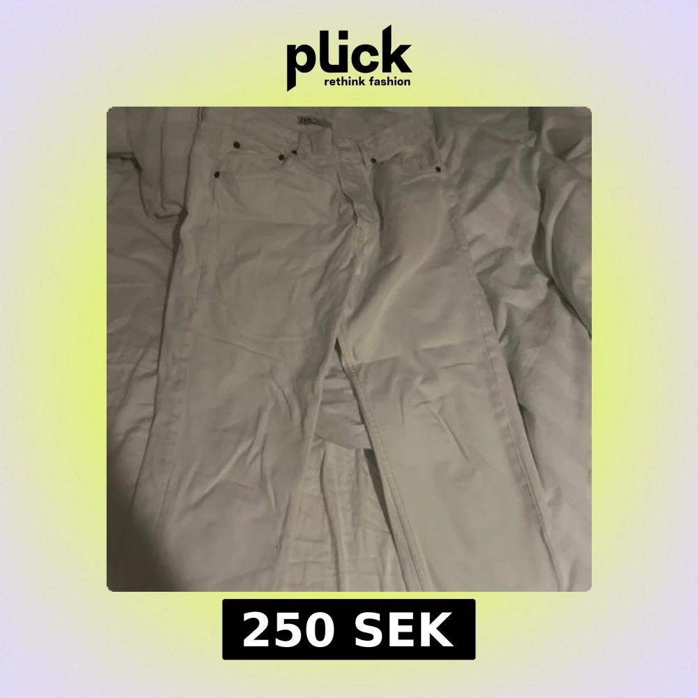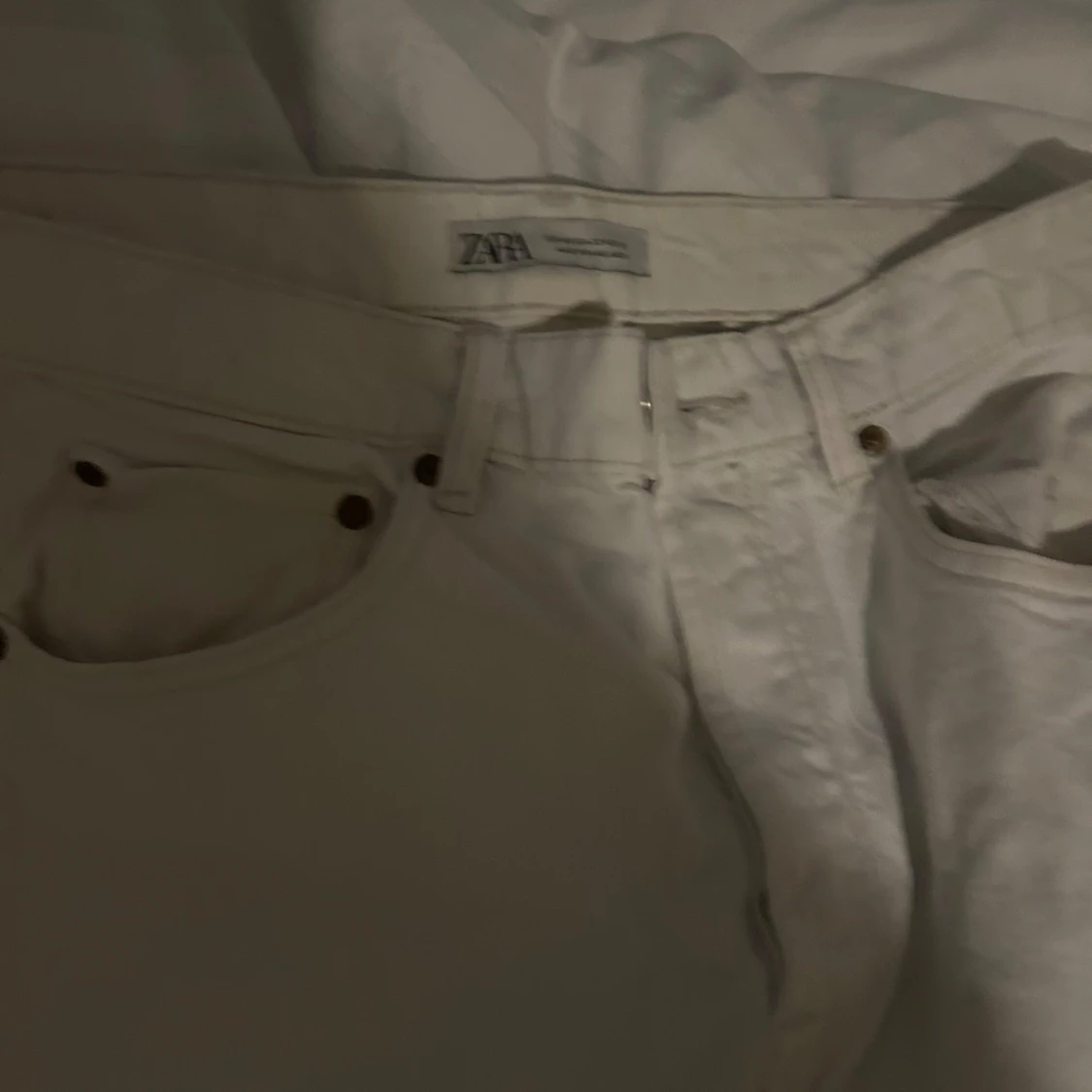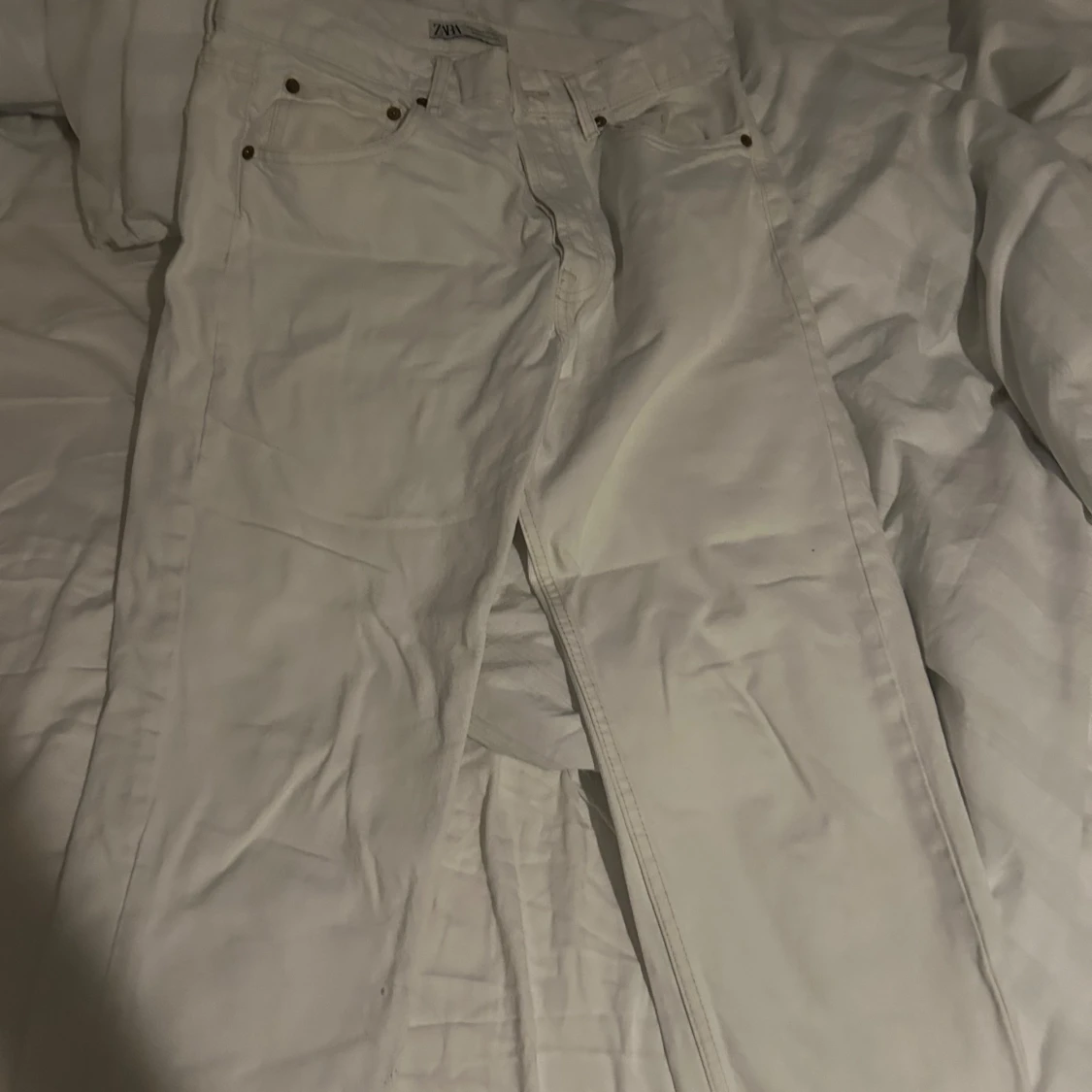 Säljer ett par vita jeans från Zara med klassisk femficksdesign och raka ben. Byxorna har bälteshällor, metallnitar och är tillverkade i bomull. Perfekta för dig som vill ha en clean och fräsch look.