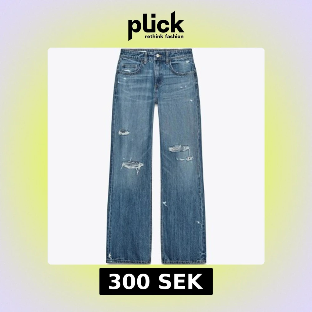 INTRESSEKOLL på ett par blåa jeans med breda ben och slitna detaljer på både fram- och baksida. Jeansen har klassisk femficksdesign, låg midja och är tillverkade i denim. Perfekta för en avslappnad och trendig look. Så populära och snygga, men tyvärr för stora och långa på mig ❣️