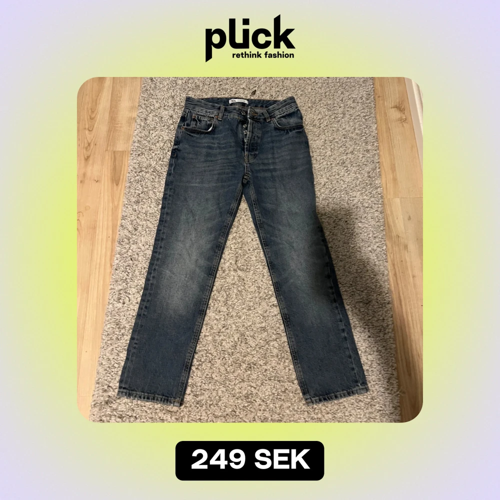 Säljer ett par klassiska blå jeansbyxor i bra skick. De har en straight passform och är perfekta för vardagsbruk. Byxorna har en traditionell femficksdesign och stängs med dragkedja och knapp. Perfekta för både höst och vår!