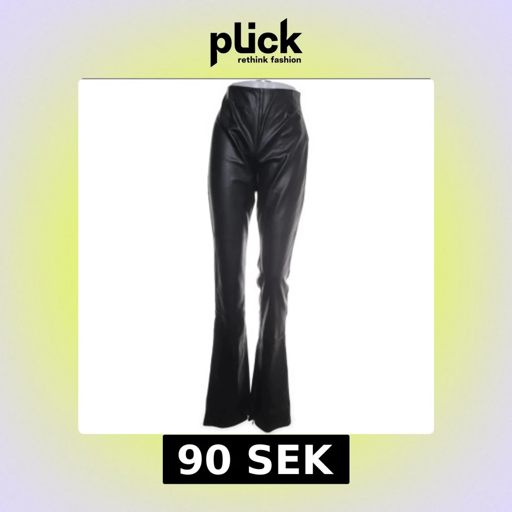 Snygga svarta byxor från Zara i skinnimitation med hög midja och bootcut-ben. Byxorna har en clean look utan synliga fickor eller detaljer, vilket ger en stilren vibe. Perfekta för dig som vill sticka ut med en edgy stil. Storlek L men sitter som en s/m. Då den är liten i storleken