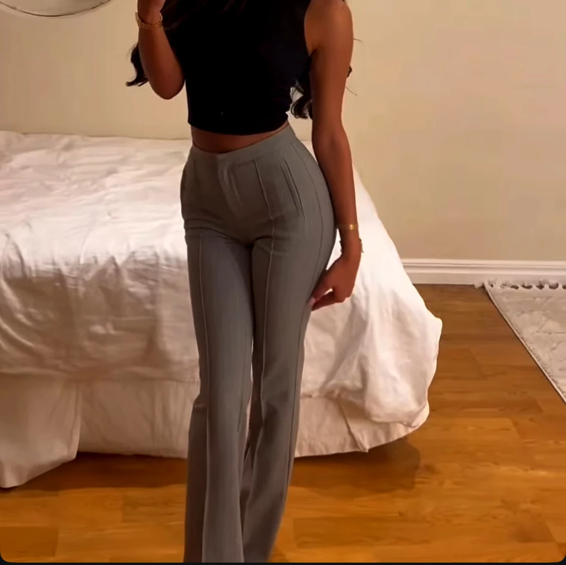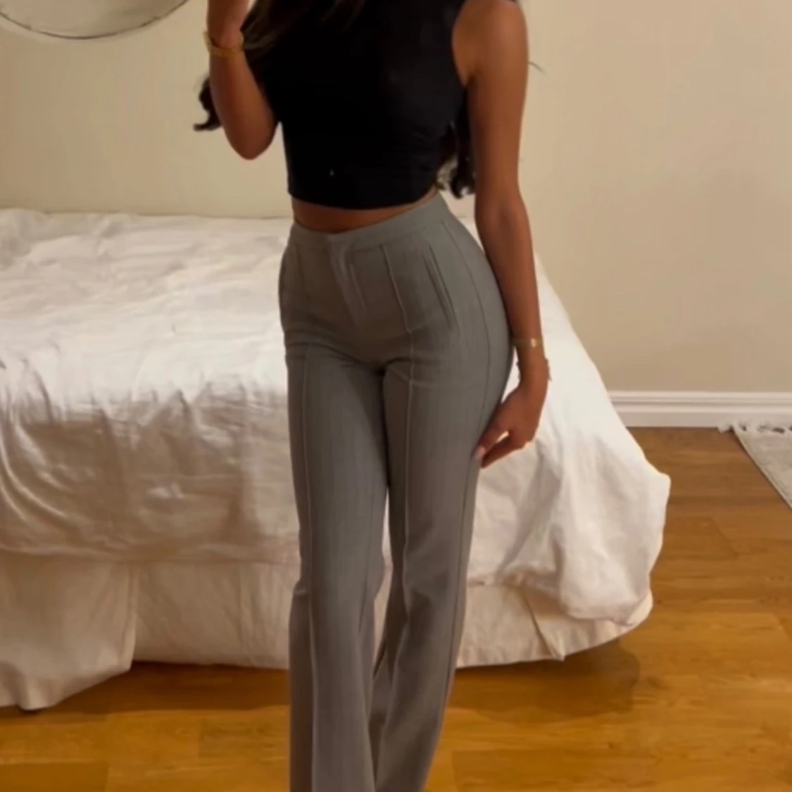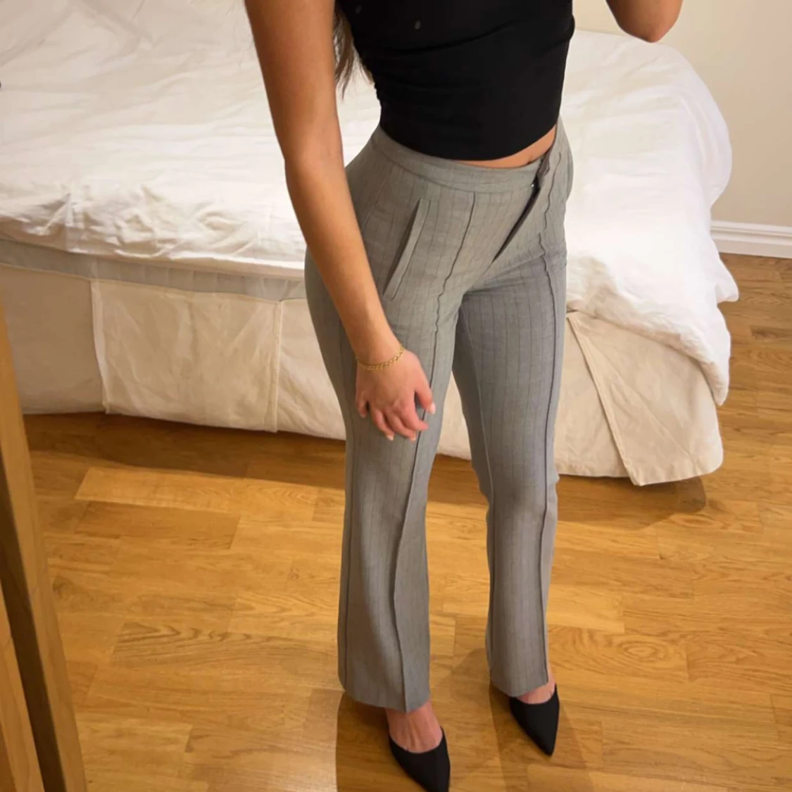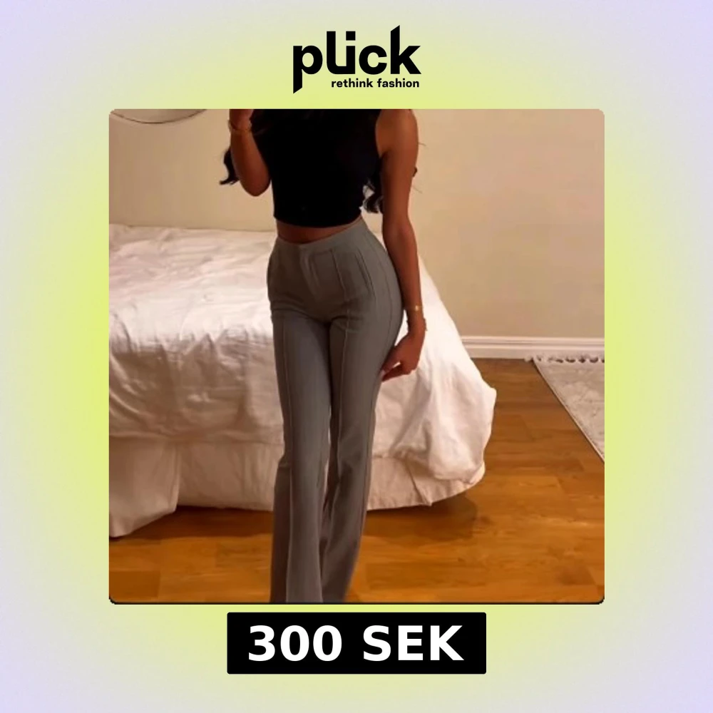 Snygga grå kostymbyxor med hög midja och raka ben. Byxorna har diskreta vertikala ränder och pressveck framtill för en clean look. Perfekt passform som framhäver midjan och ger en stilren siluett. Materialet känns mjukt och följsamt. endast använda en gång