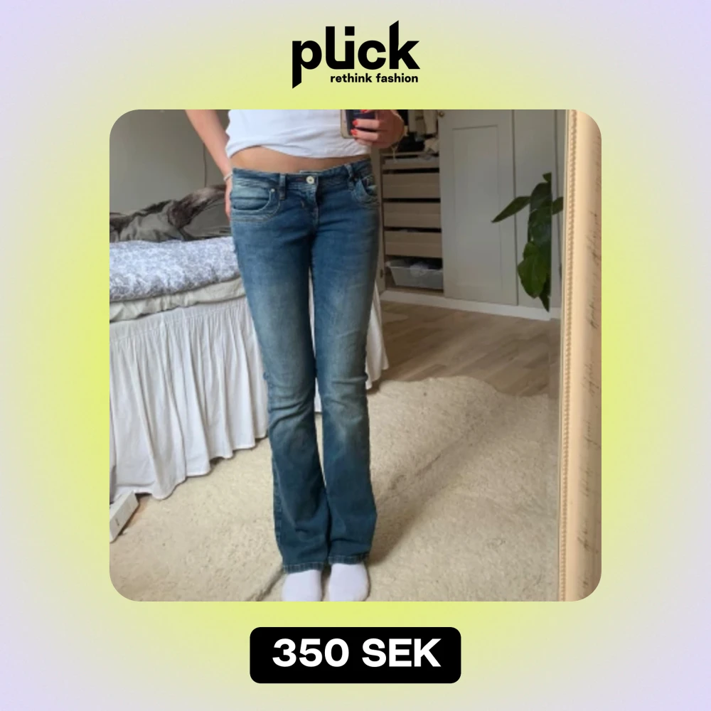 Säljer ett par snygga blå bootcut jeans. De har en klassisk femficksdesign och en knapp- och dragkedjestängning. Perfekta för en avslappnad vardagslook!