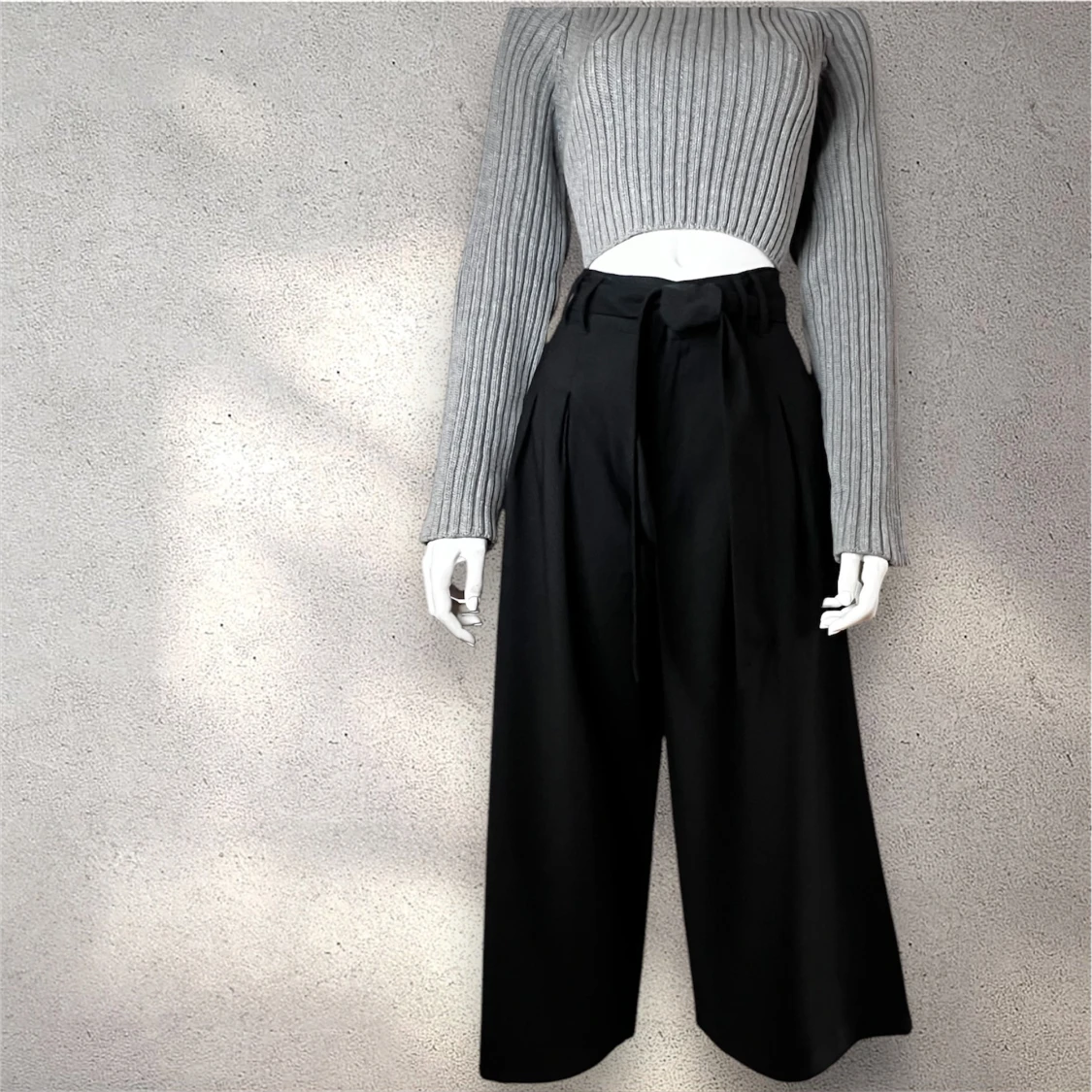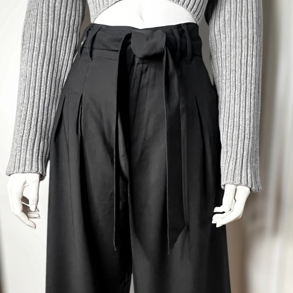 Snygga svarta byxor från Zara med hög midja och knytband i midjan. Byxorna har en loose passform och vida ben, vilket ger en stilren och modern look. Perfekta för en chic och avslappnad stil.