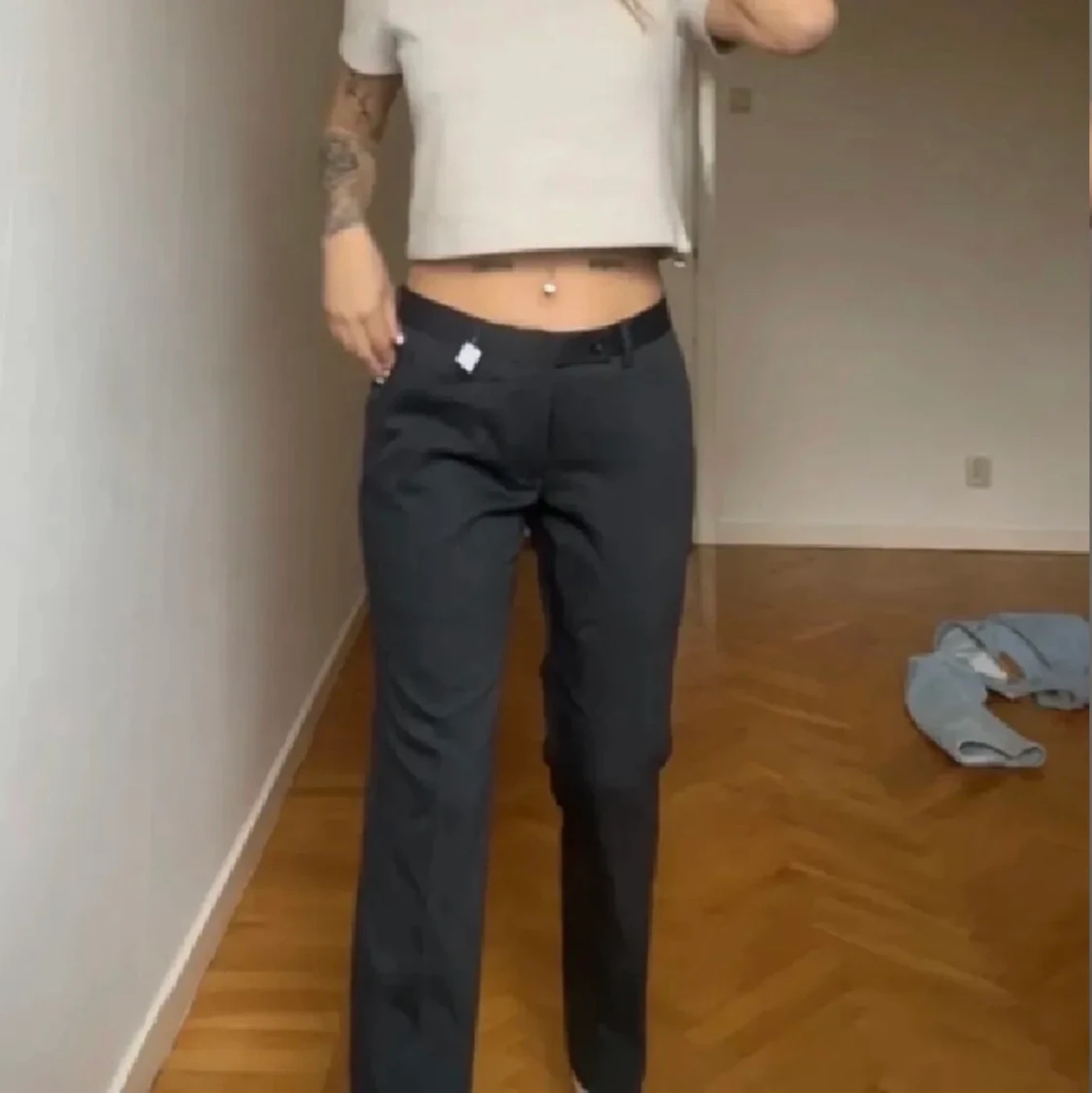 Ett par jättefina mörk gråa lågmidjade på kostymbyxor. Står ingen storlek men passar mig som oftast bär i storleken 34/36.