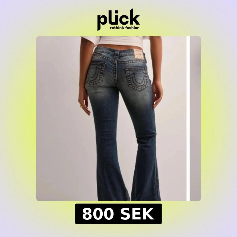 Snygga blå jeans från True Religion med bootcut passform och röda kontrastsömmar. Klassiska bakfickor med märkets ikoniska broderi och patch bak i midjan. Jeansen har ultra låg midja och är tillverkade i slitstarkt denimtyg. Använda två gånger💕 storlek 27!