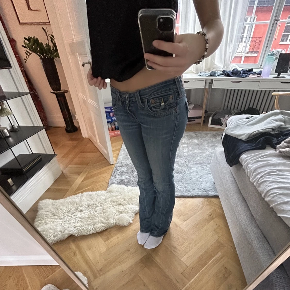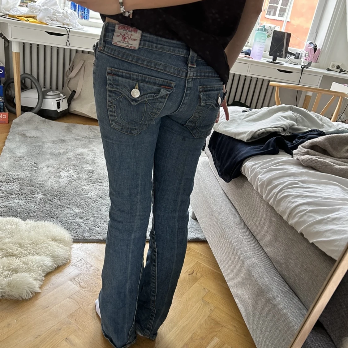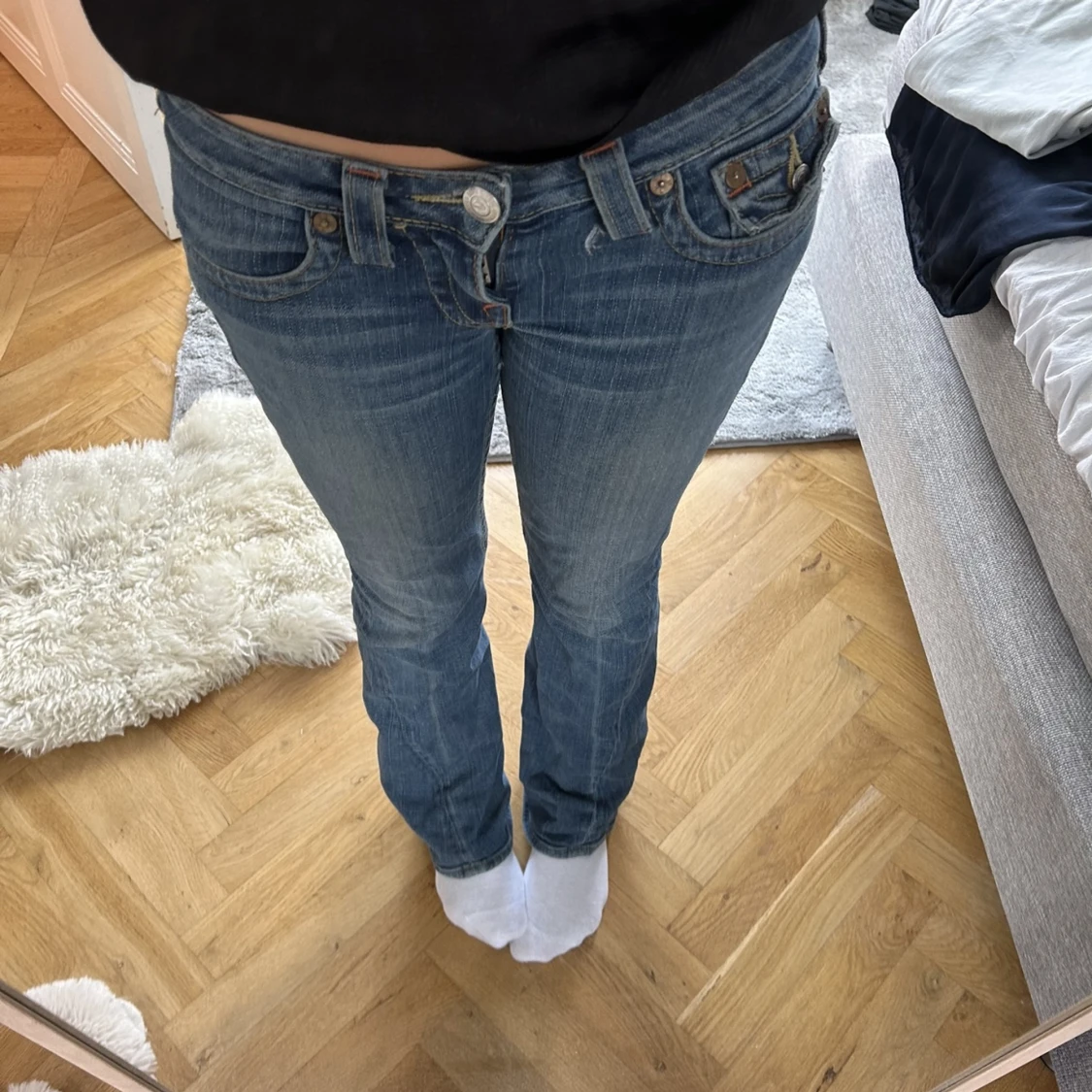 Lågmidjade mörkblåa true religon jeans. Sjukt snygga, lite slitna på benen annars bra skick! Har vanligtvis strl 36/38 i zara jeans!! Innebenlängd: 84cm och mått direkt över midja är 38💕