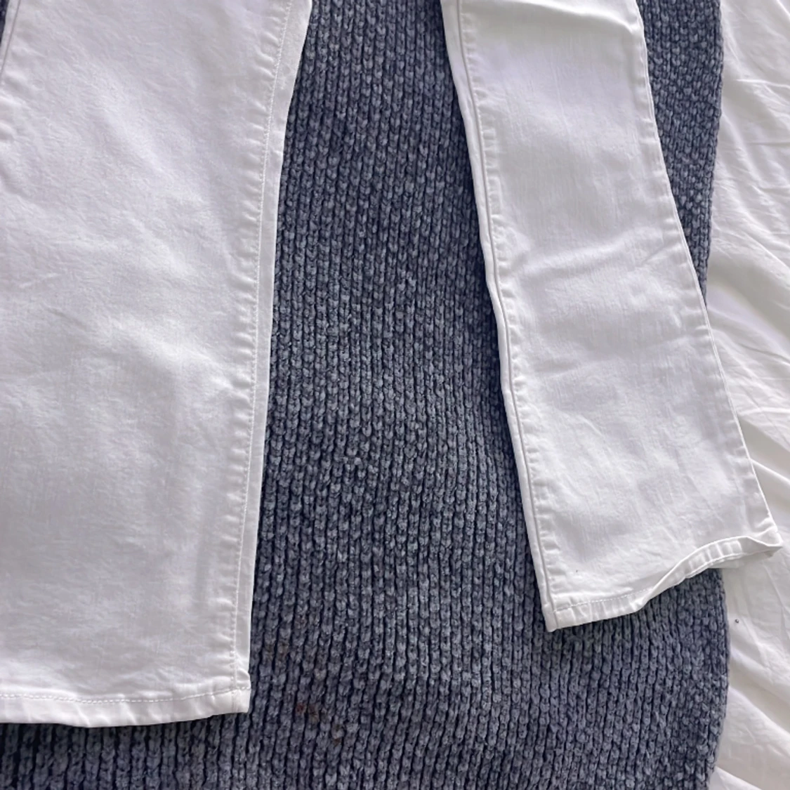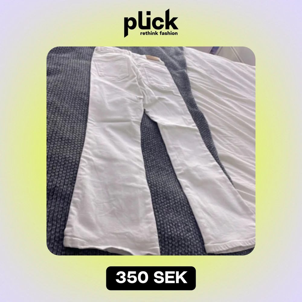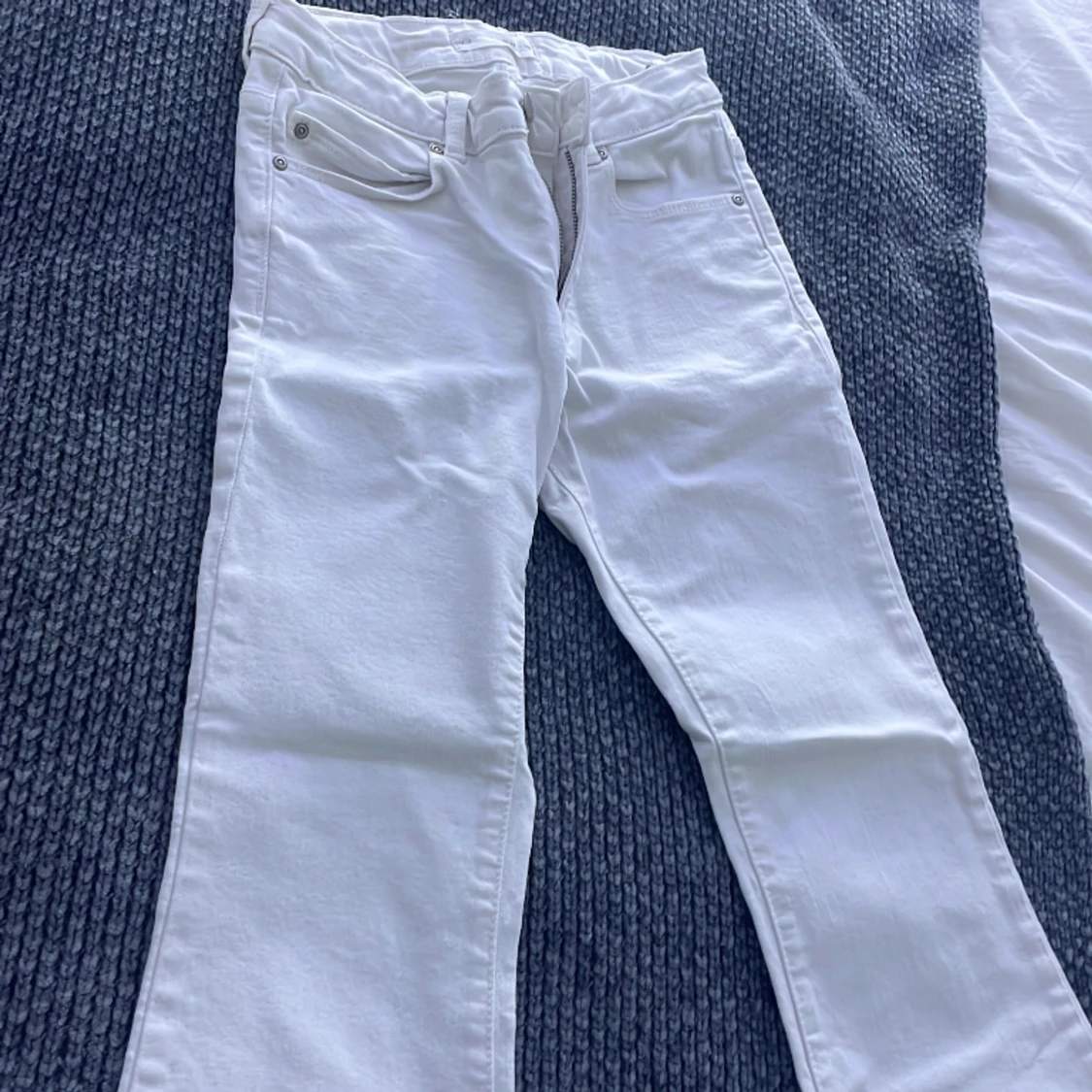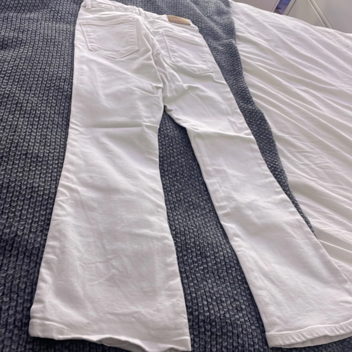 Det är vita utslängda jeans helt nya aldrig andvänt pg av att dem va för små. Ordinarie pris är 500 kr men säljer för 350
