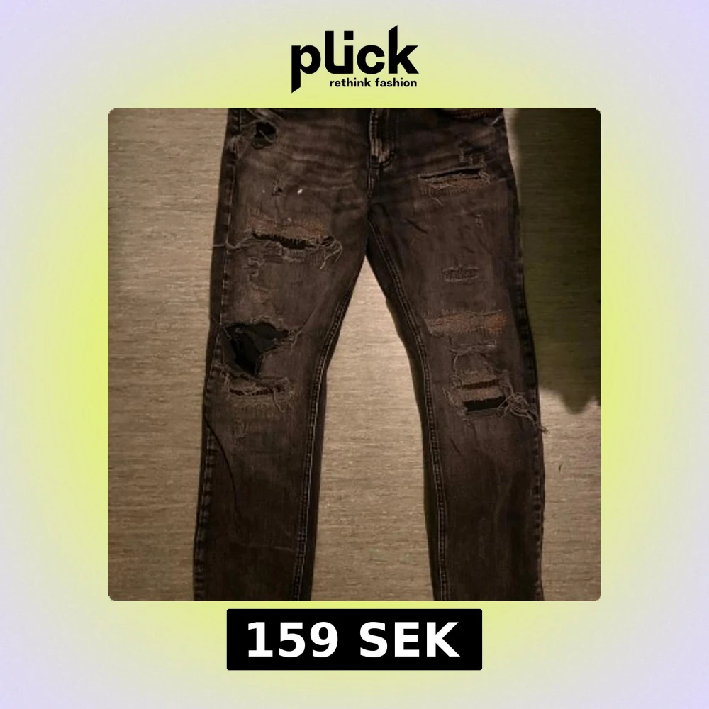 Säljer ett par svarta jeans från Zara med snygga slitningar och hål på benen för en edgy look. Jeansen har smal passform och klassisk femficksdesign. Perfekta för dig som gillar streetstyle och vill sticka ut lite extra.