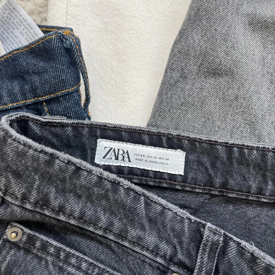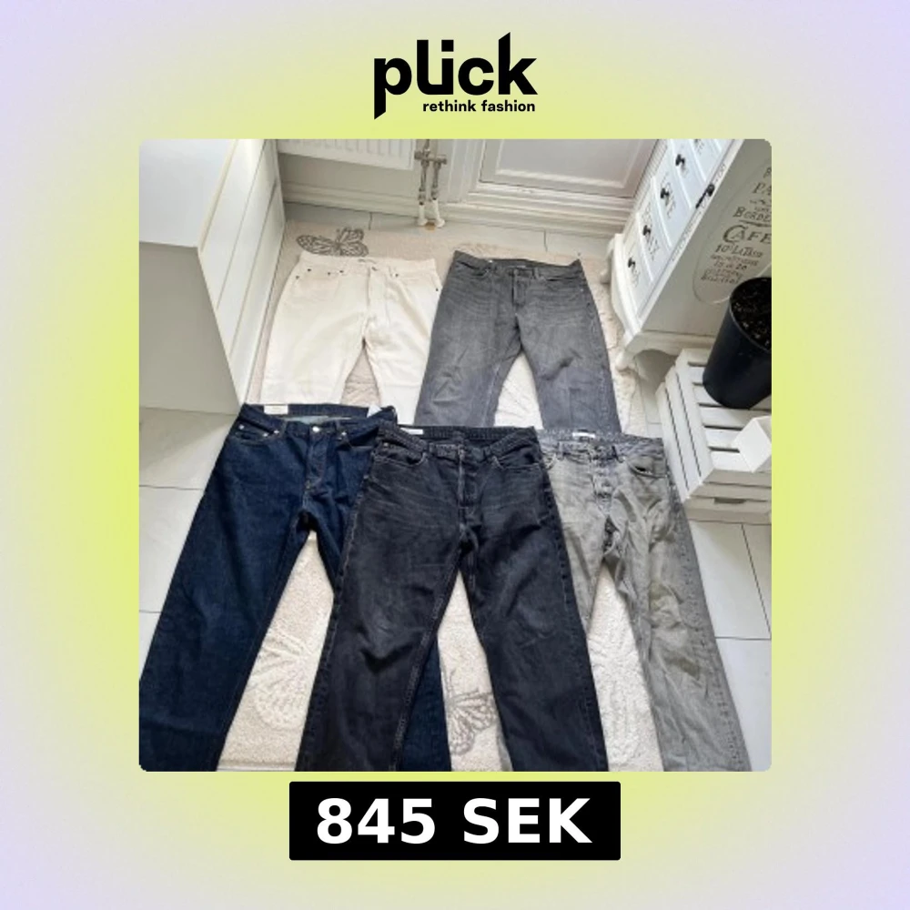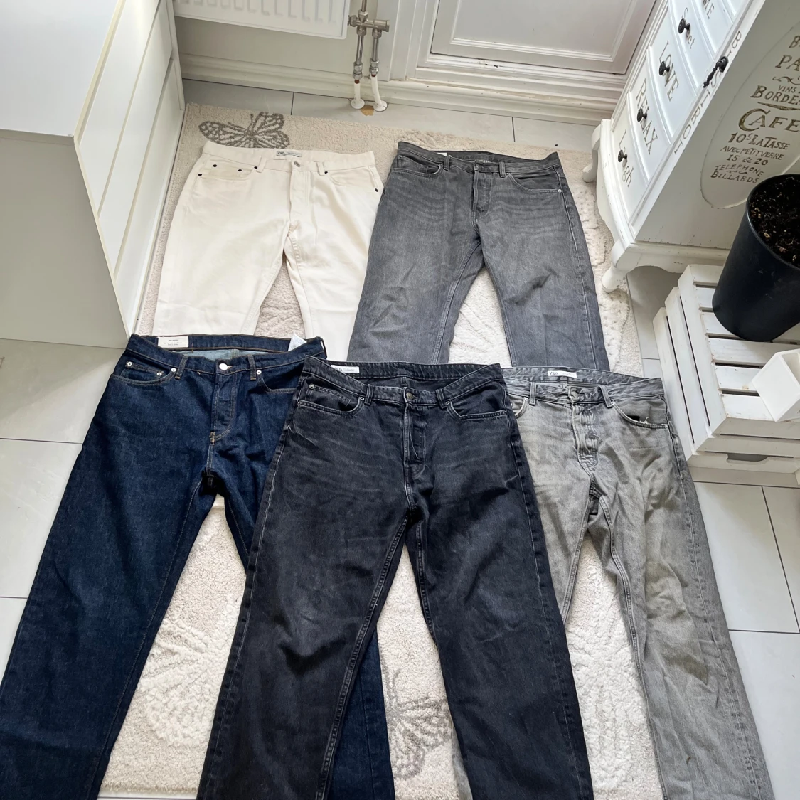Totalt 5 par jeans! Alla är från Zara, straight fit på varenda en Storlek 44 Zara vilket motsvarar Waist 34 Alla ser helt nya ut men har kommit till användning Mörkblå, tvättad svart, ljusgrå, mörkgrå och vit färg Skicka meddelande vid några funderingar Kolla gärna även in mina andra annonser