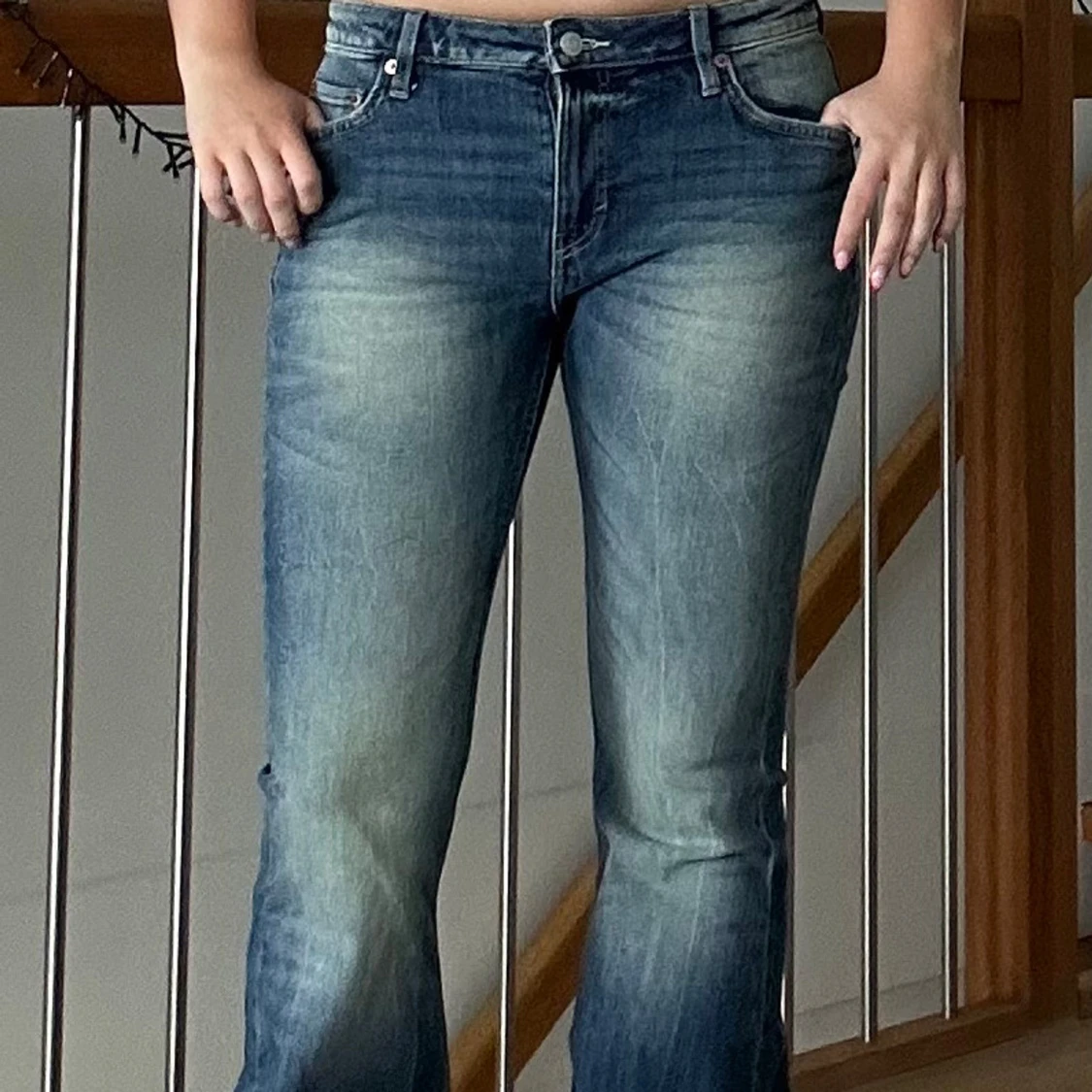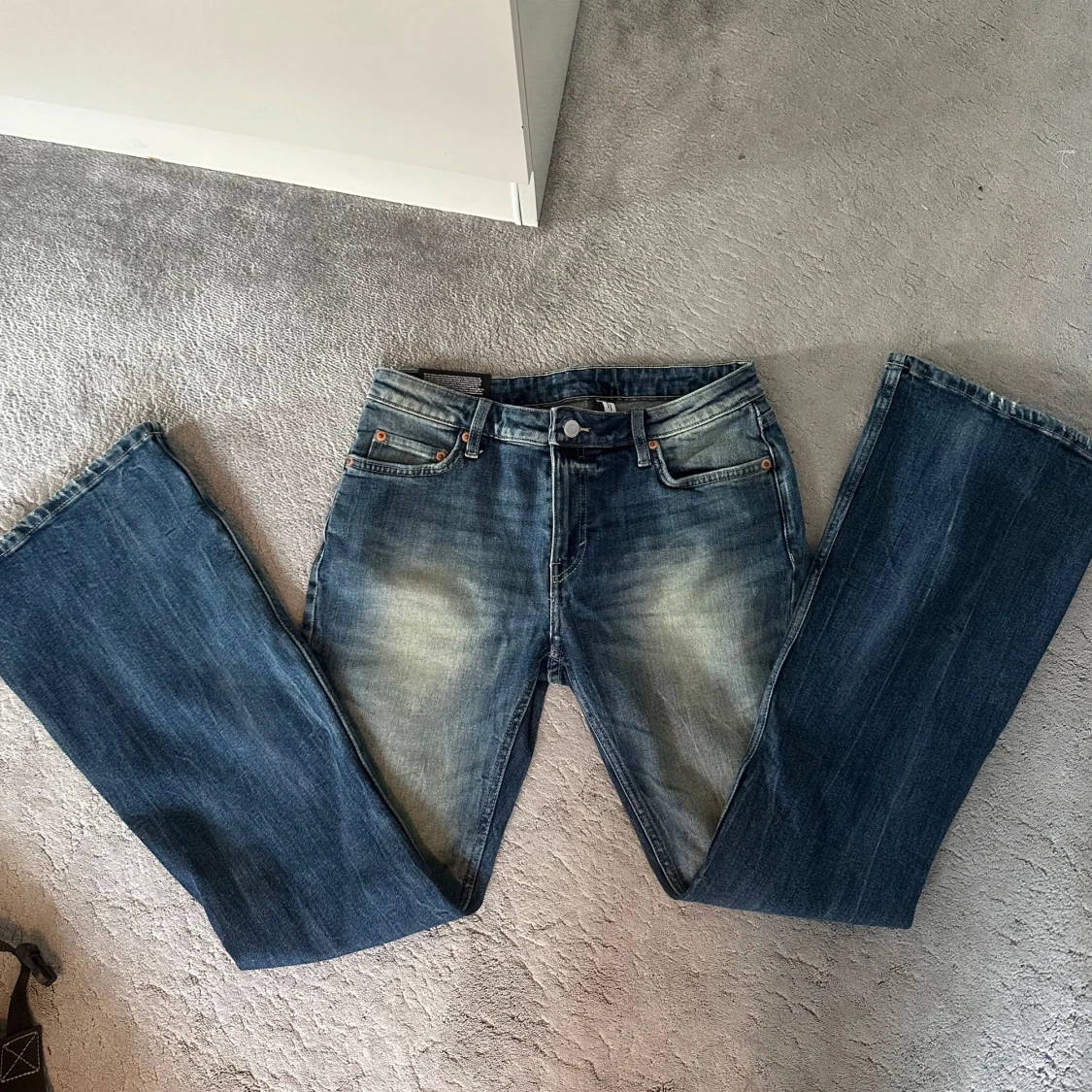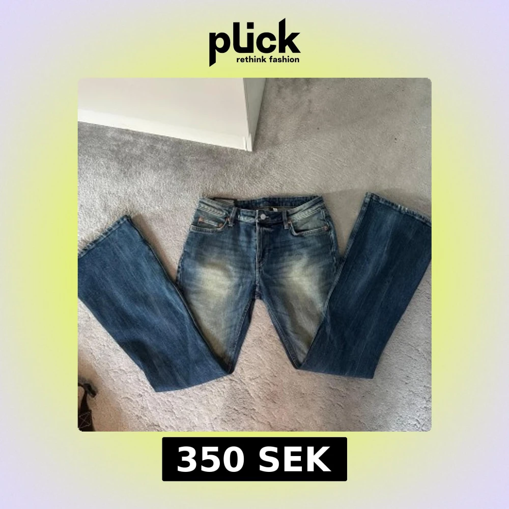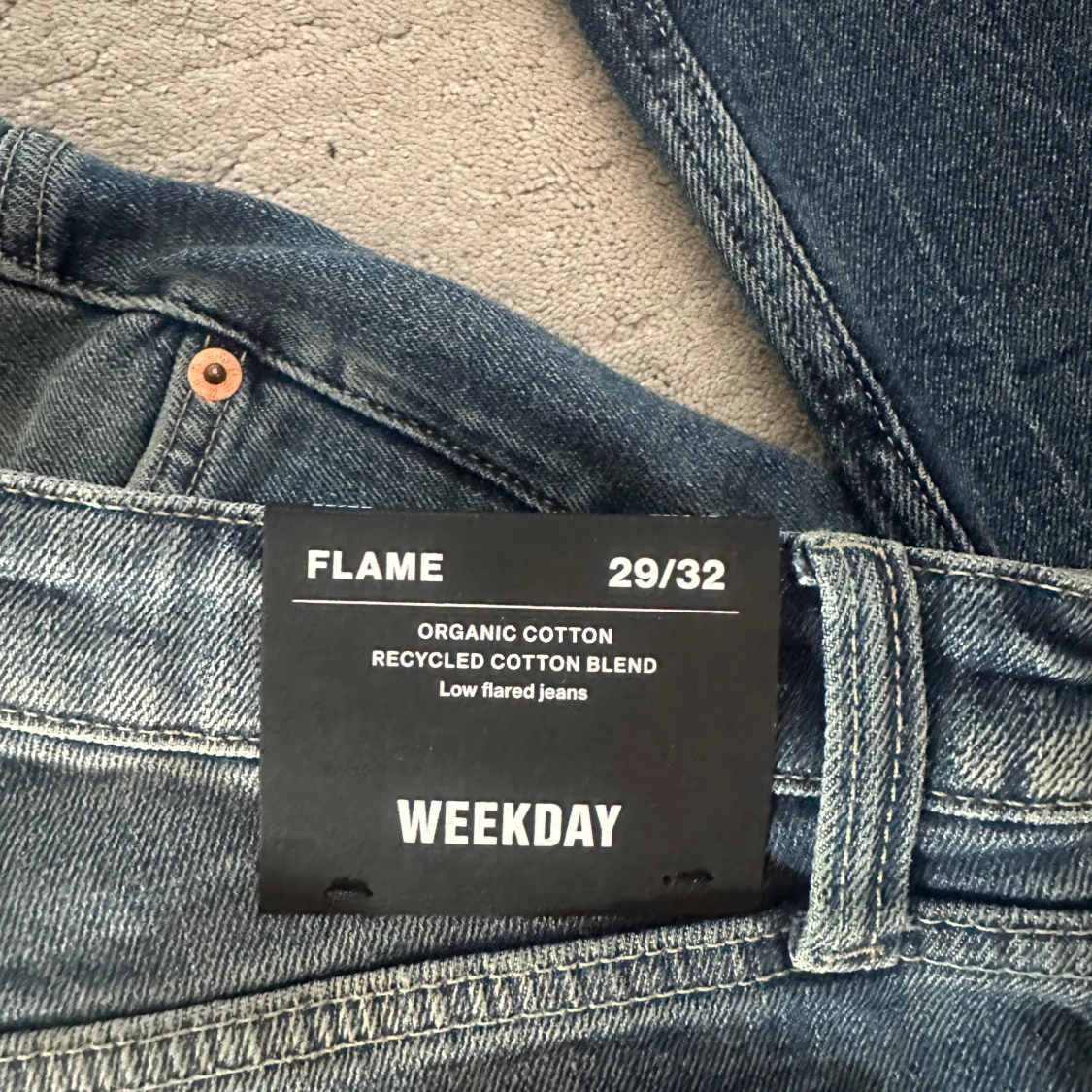 Säljer ett par blå flared jeans från Weekday, modell Flame. Storlek 29/32 och passar mig som brukar ha M och är 163 lång. Helt nya med prislapp