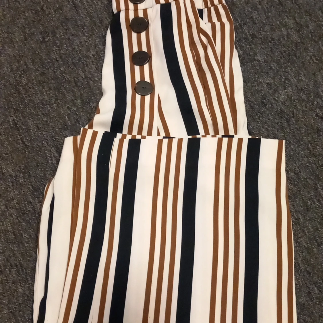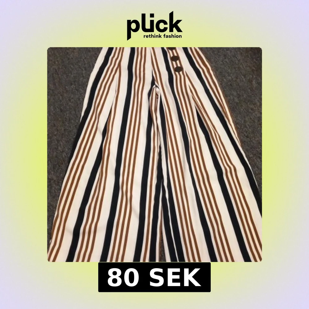 Snygga highwaist byxor från Zara i storlek XS med breda ben och vertikala ränder i svart, brunt och vitt. Byxorna har knappar framtill och elastisk midja för extra komfort. Perfekta för en trendig och avslappnad look.