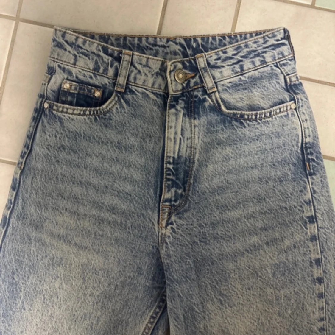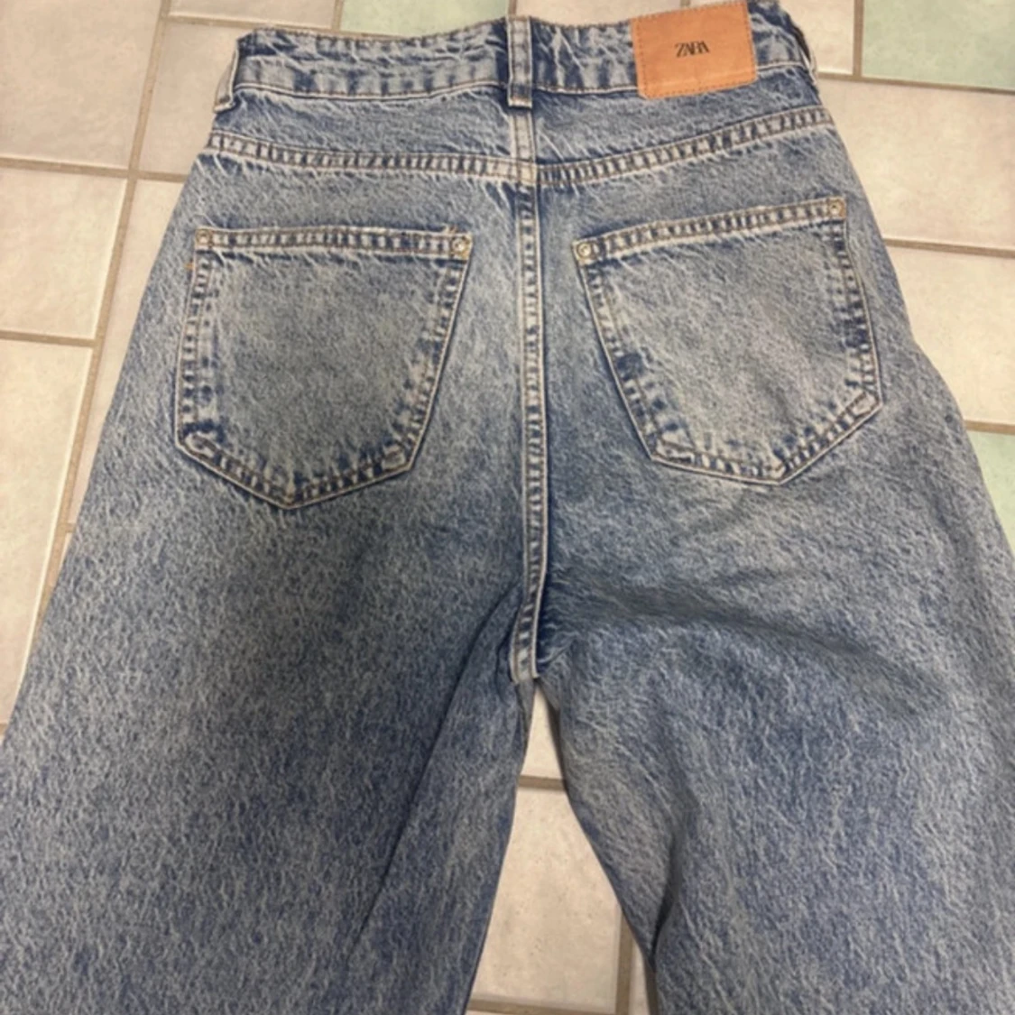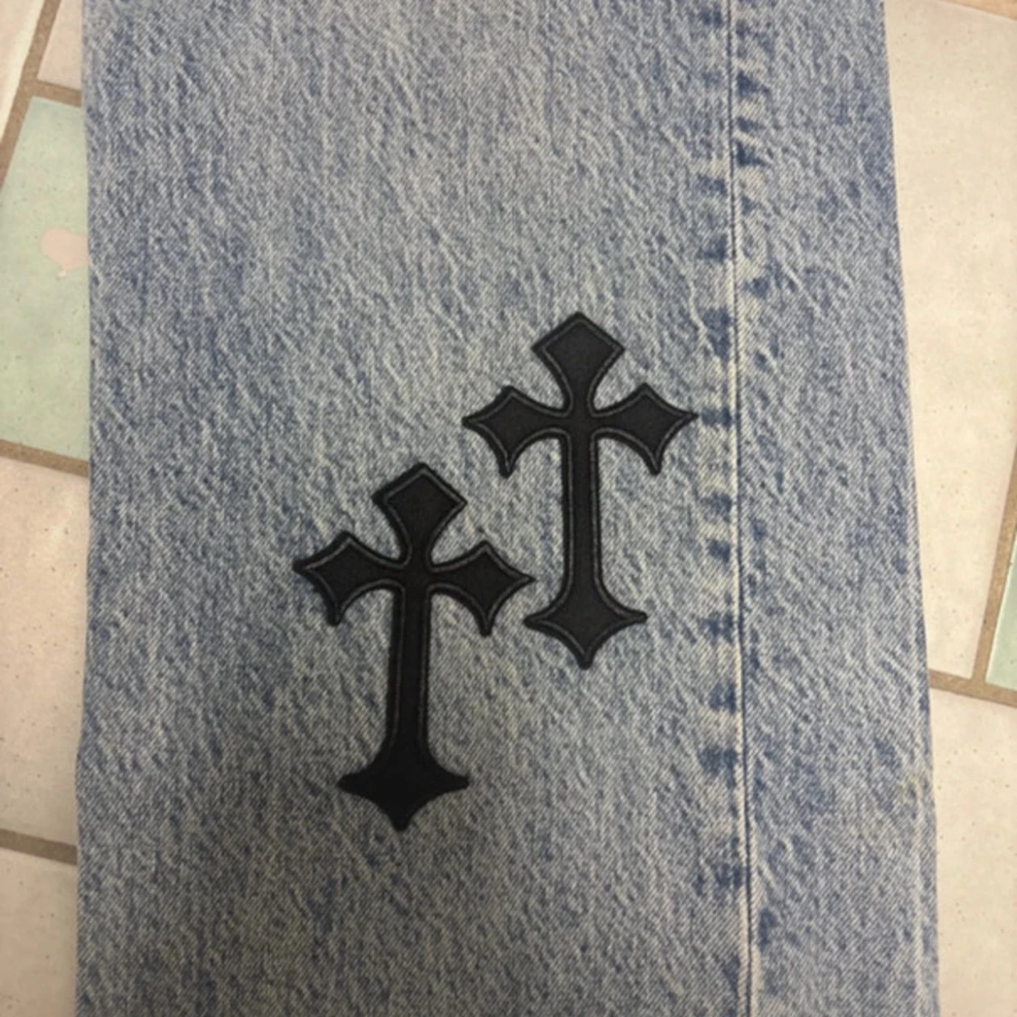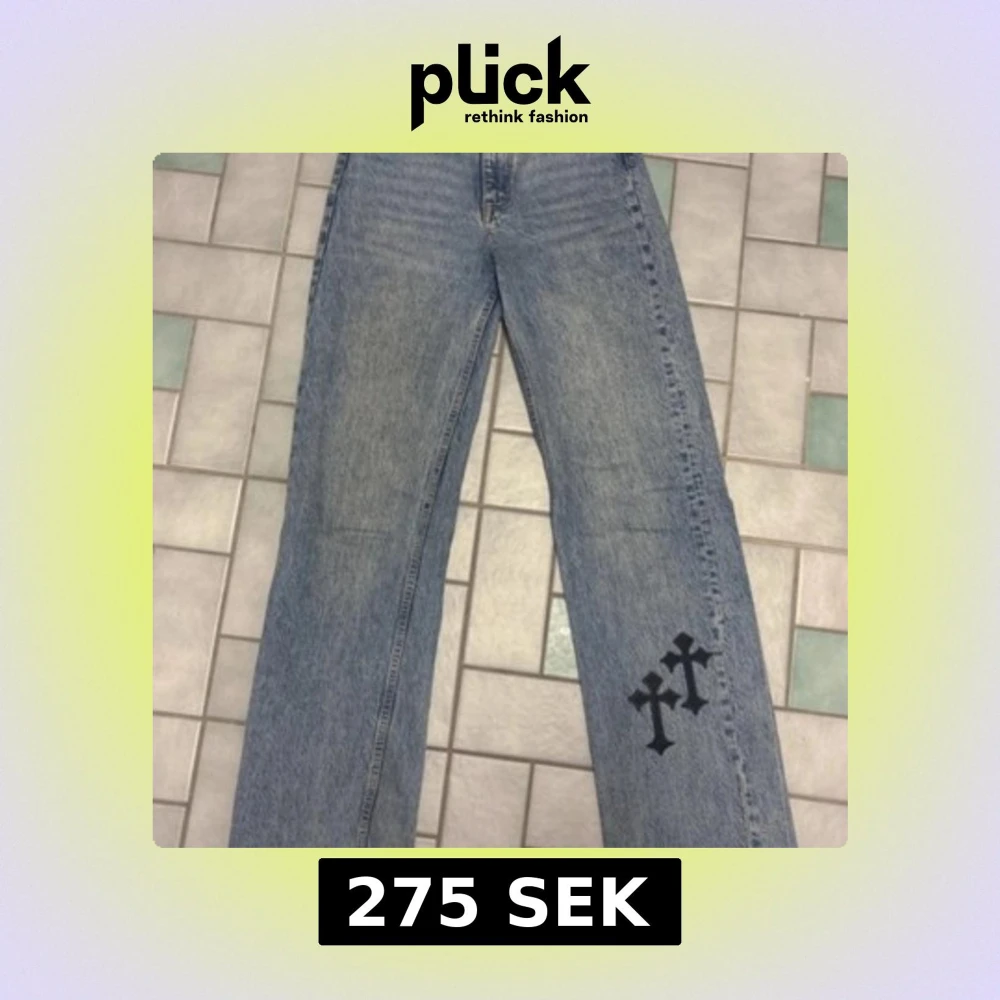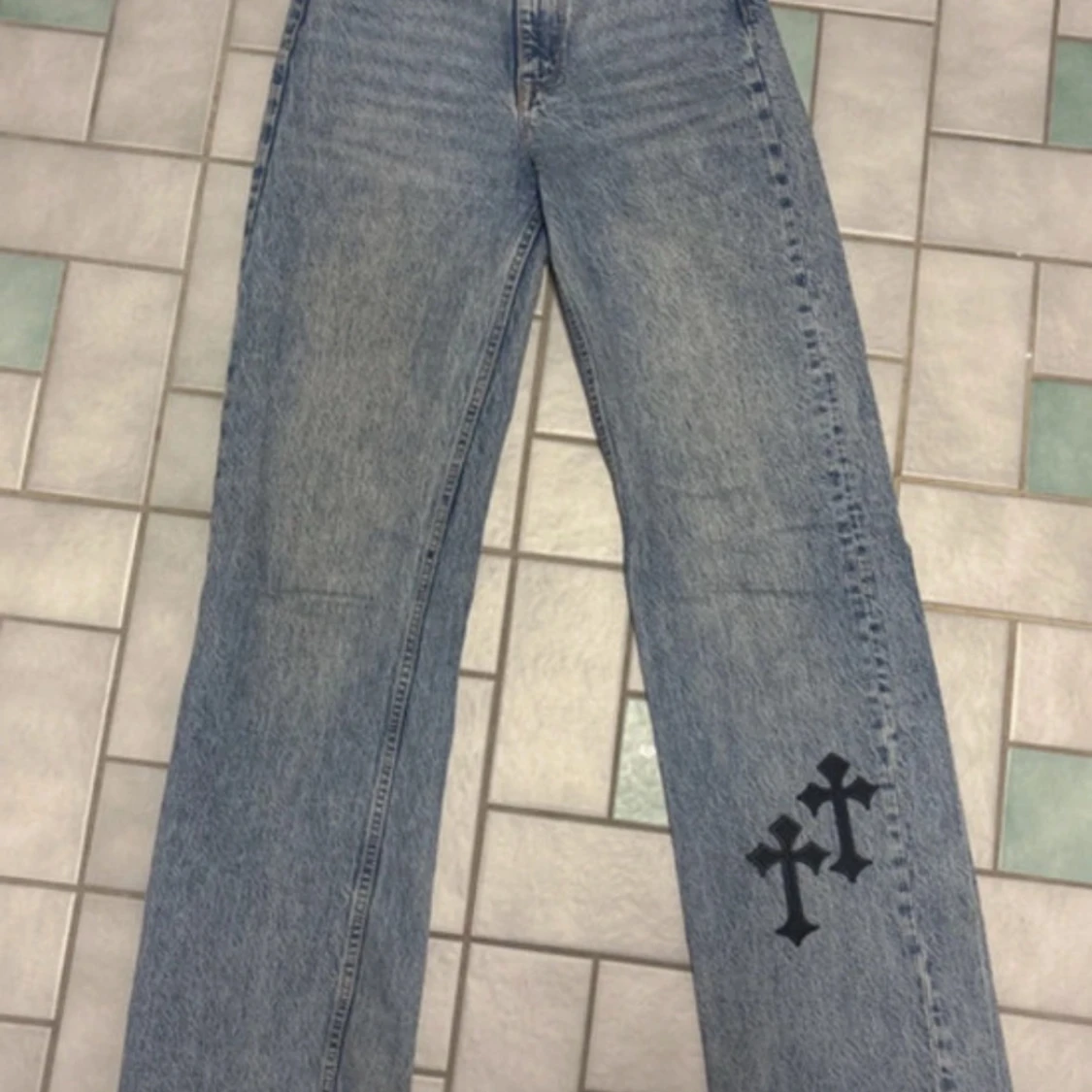 Säljer ett par blå jeans från Zara med raka ben och två svarta kors som detalj på ena benet. Klassisk femficksmodell med knapp och dragkedja framtill. Perfekta för dig som vill sticka ut lite extra.