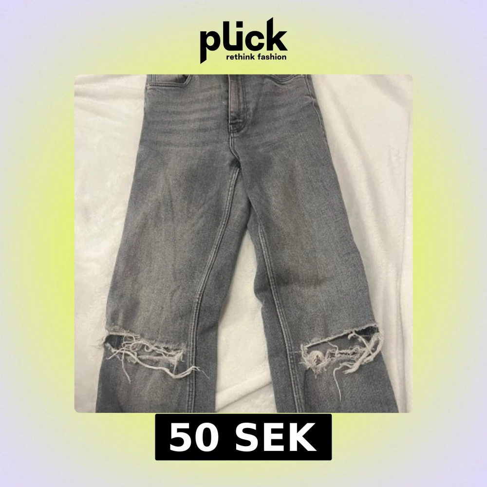 Säljer ett par grå jeans med snygga slitningar och stora hål vid båda knäna. Jeansen har rak passform och klassisk femficksdesign. Perfekta för dig som gillar en avslappnad och trendig streetstil. Använda