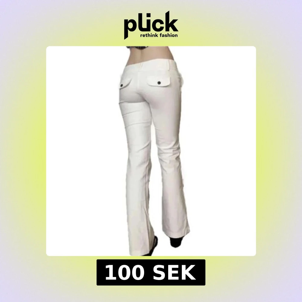 Snygga vita byxor med låg midja och bootcut-snitt. Byxorna har två bakfickor med lock och knappdetaljer samt klassisk knappstängning fram. Perfekta för dig som gillar en clean och fräsch look materialet är demin o midjemått ca 36/37.