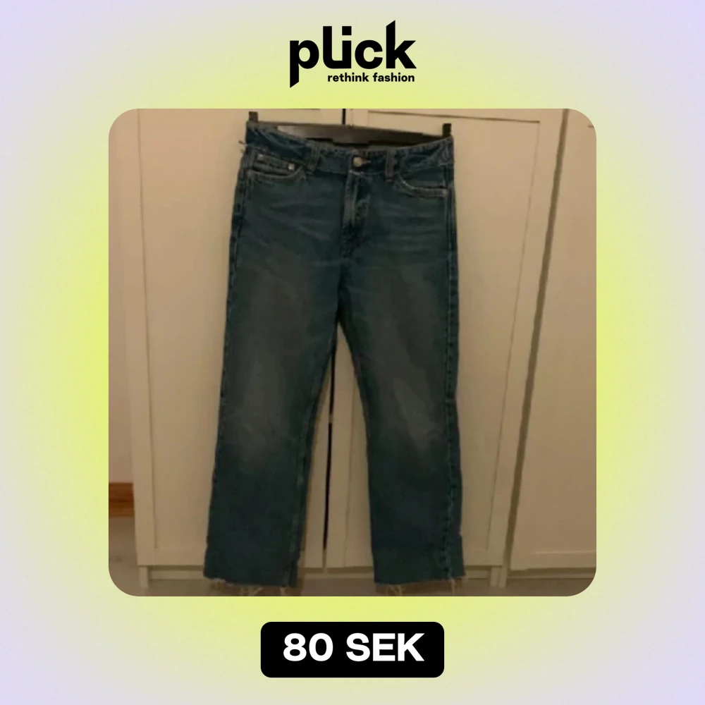 Ett par blå jeansbyxor med klassisk fyrficksdesign och knappgylf. Byxorna har en rak passform och superfina.