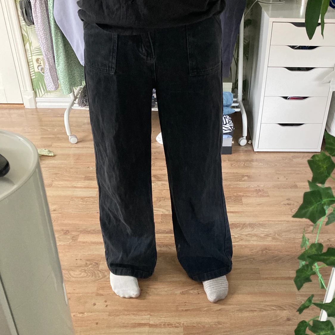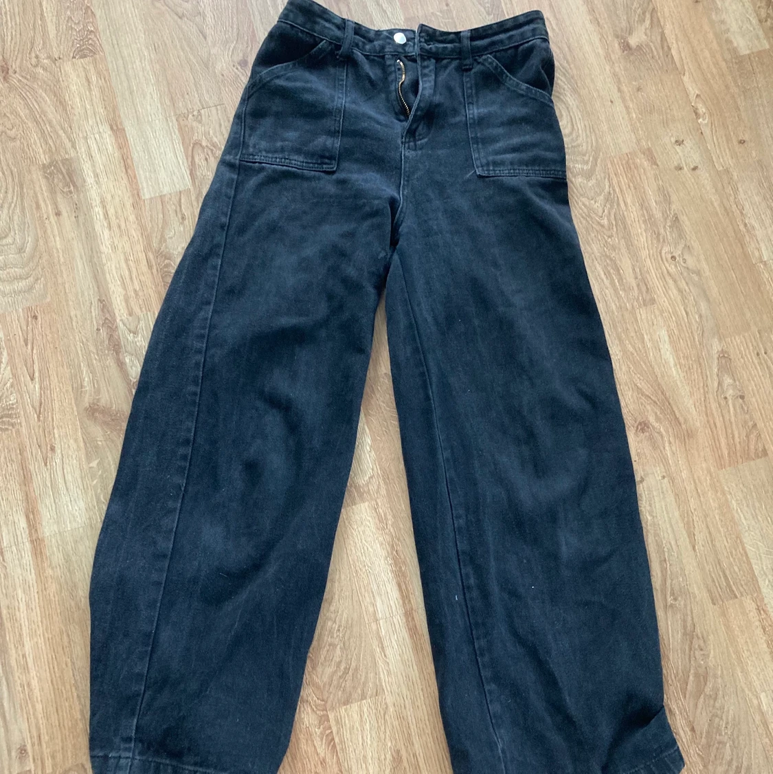 säljer ett par svarta baggy jeans. säljer då de inte längre är min stil. använda ett par gånger men fint skick. midjemått: ca 83. jag är 162 och de är bra i längden.