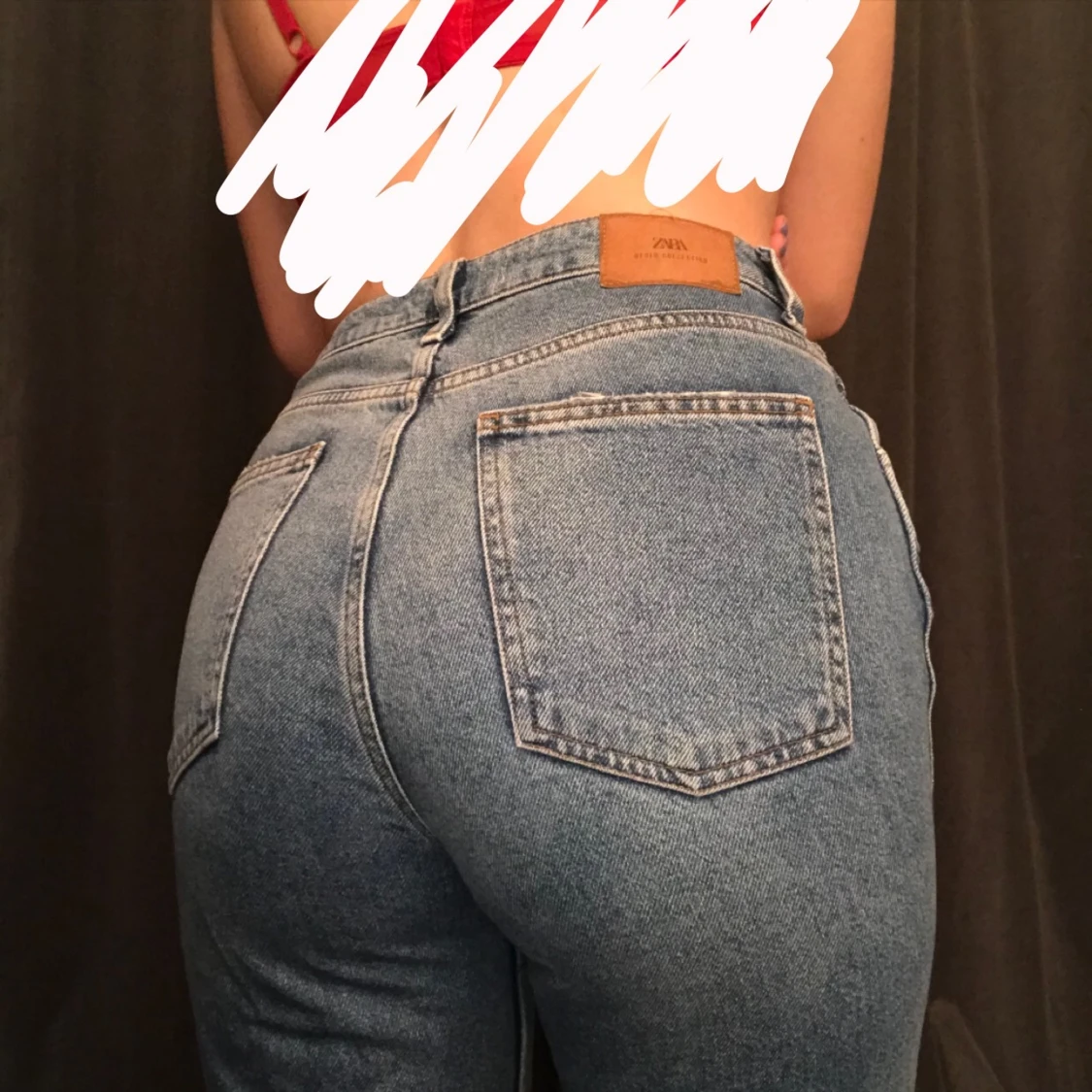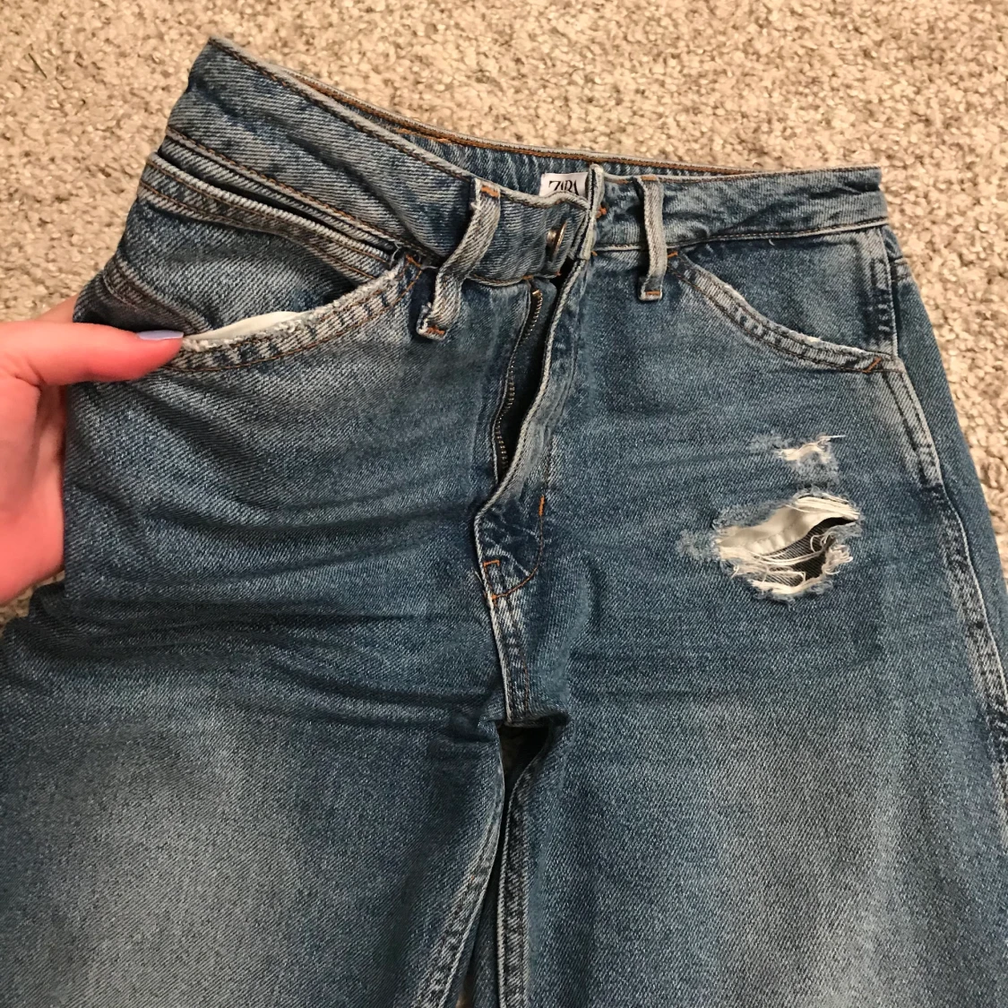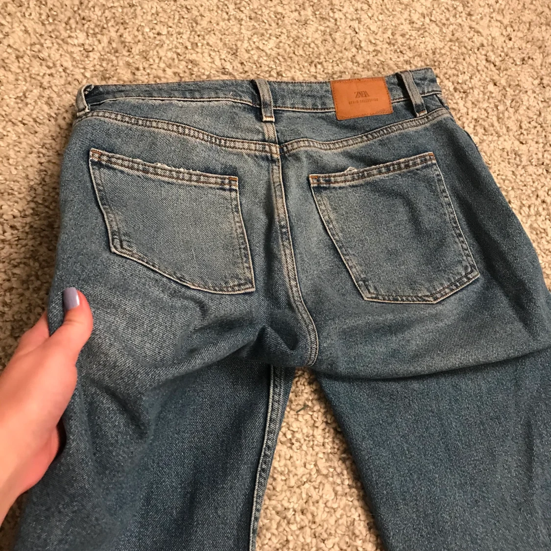 Blå flared jeans från zara, köpta i somras och är knappt använda i ny-skick! Superbekväma i fin sliten blå färg med hål på ena knäet. Skriv privat för fler bilder 💕