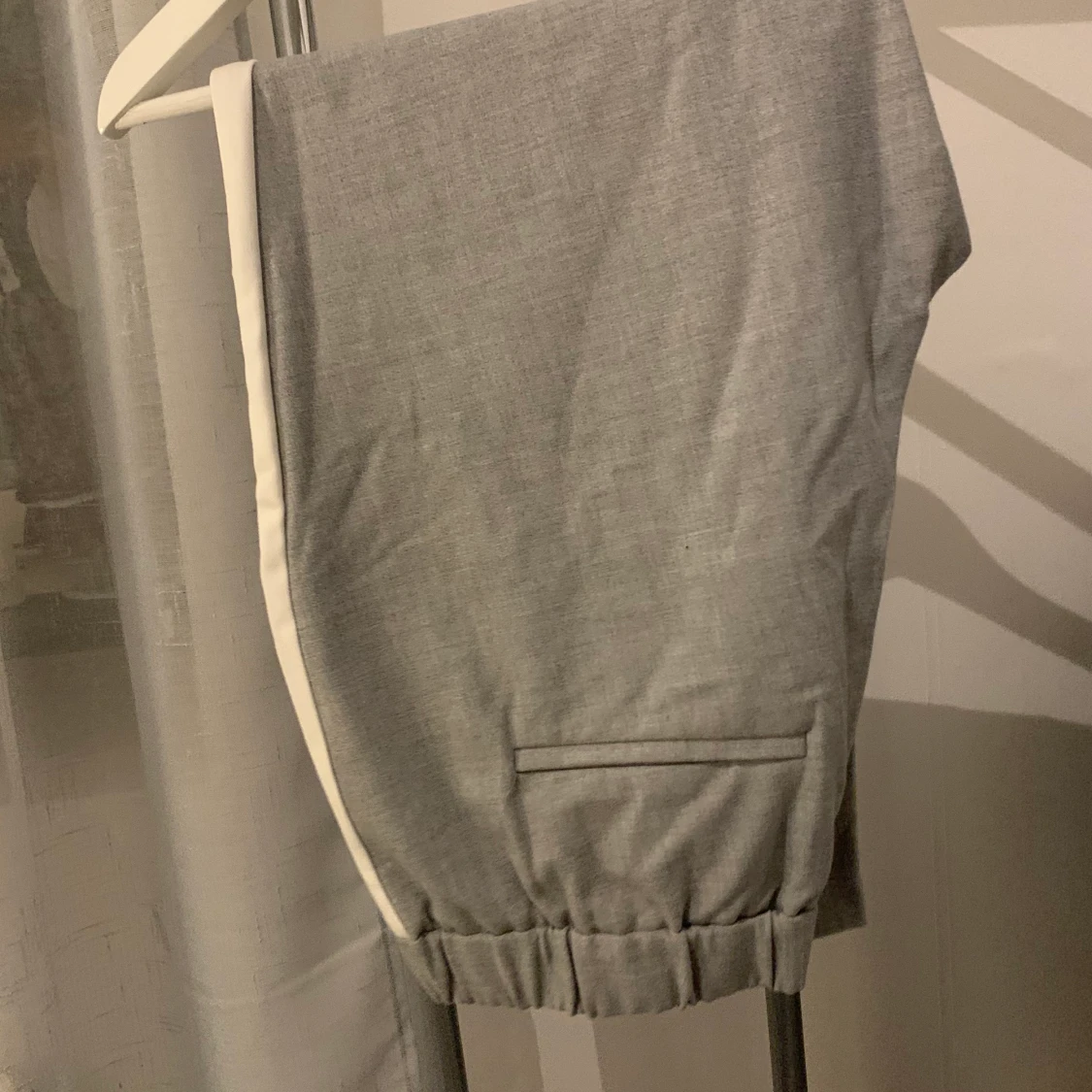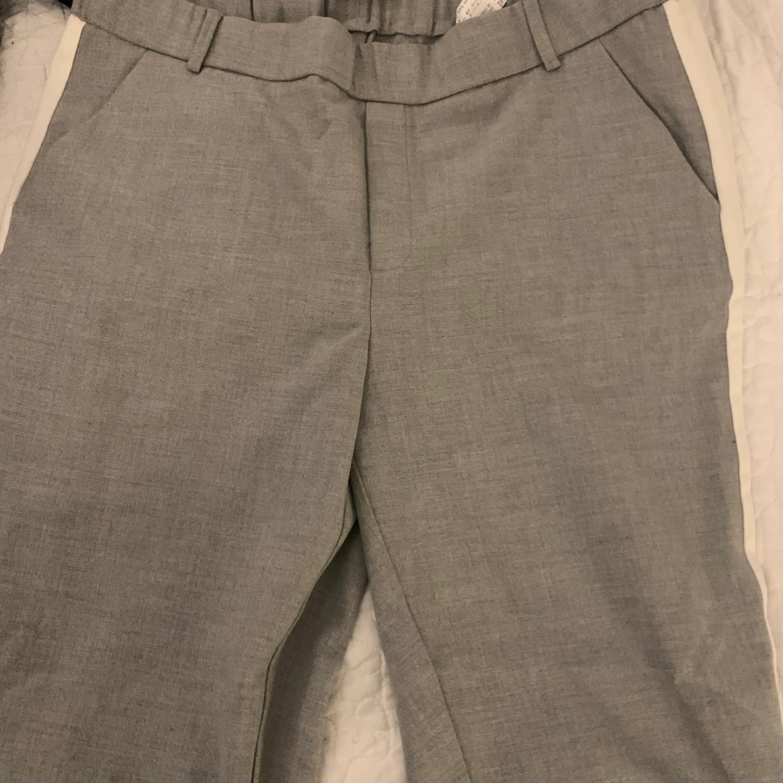 Gråa med vit linje på sidan, slutar vid fotleden och bekväma vid midjan pga resårbandet. Köpta från Zara i jättebra skick, använt de fåtal gånger. Väldigt stretchiga, passar M-L.