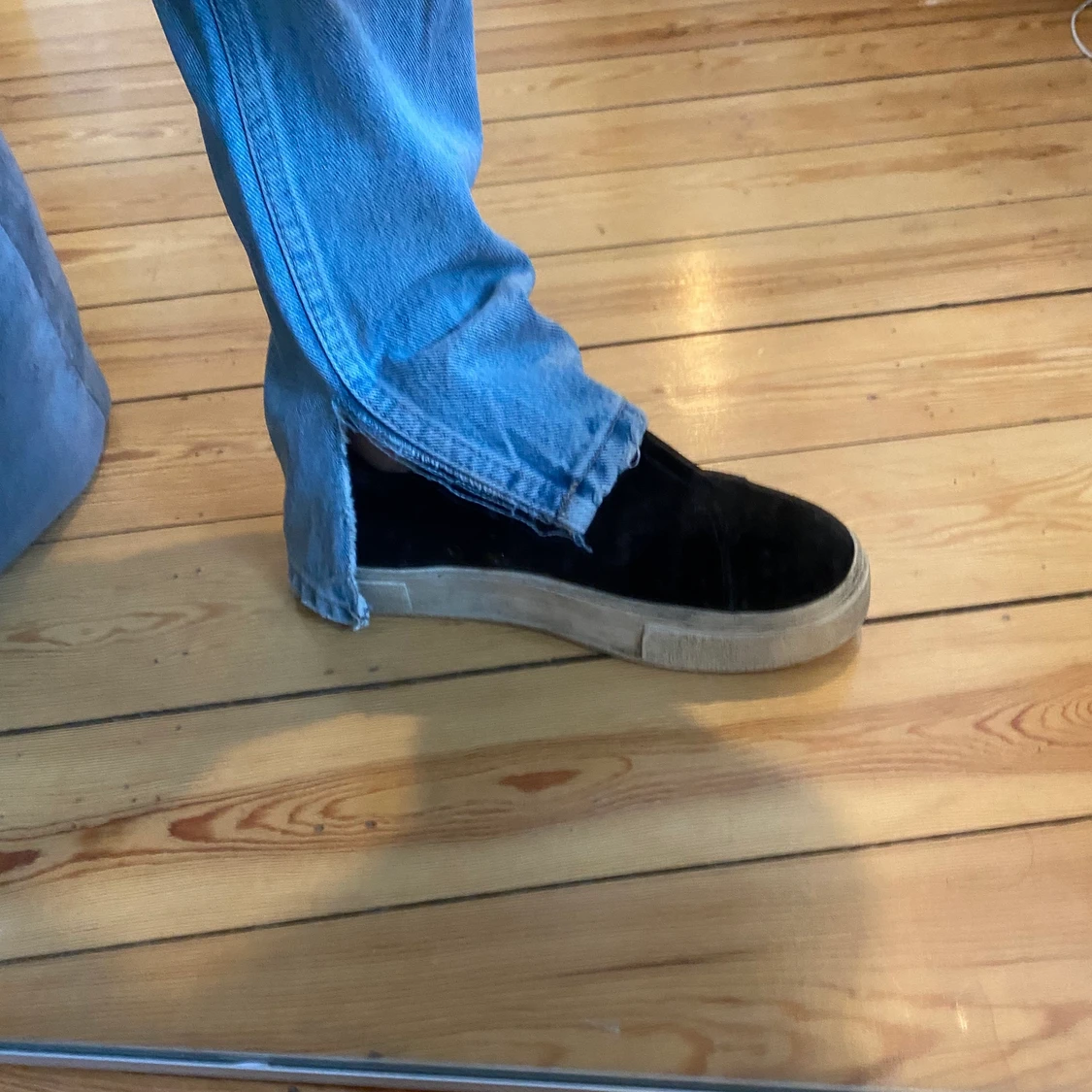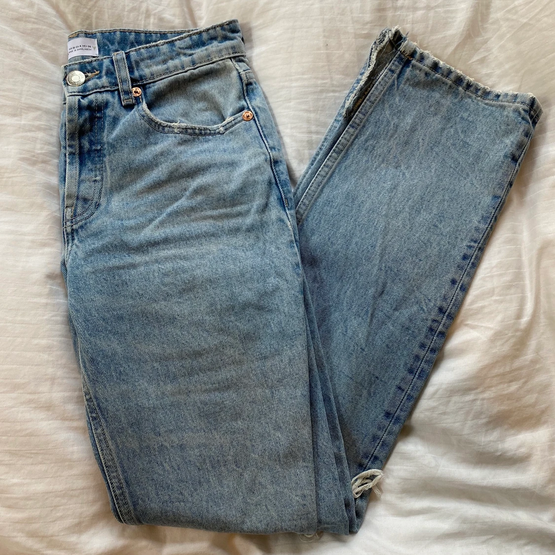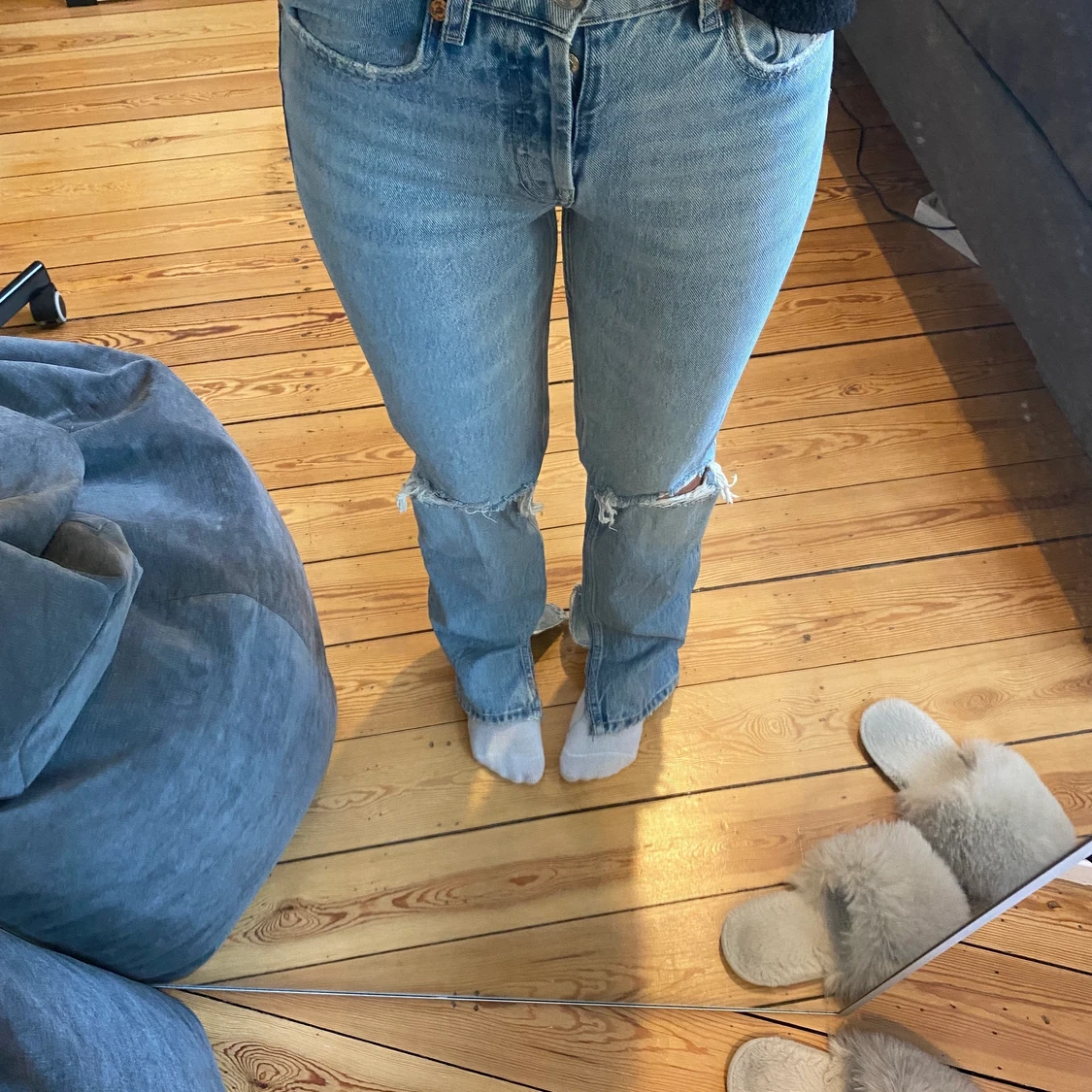 Ljusblå raka jeans från Zara med hål på knäna. Jag har klippt till en slits på båda benen då jag tyckte att de var lite långa för mig och tycker att de faller snyggare över skorna med slitsen. Dessa är använda ett fåtal gånger men är verkligen i bra skick! Jag är 1,65 och de är som sagt lite långa men tycker det är snyggt. 💗