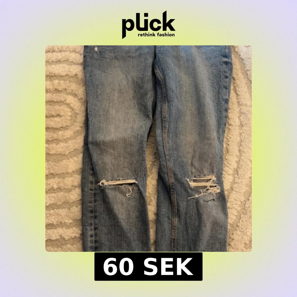 Säljer ett par ljusblå jeans från Zara med slitna detaljer och hål vid knäna. Jeansen har klassisk femficksdesign, normal passform och är tillverkade i bomull. Perfekta för en avslappnad och trendig look.