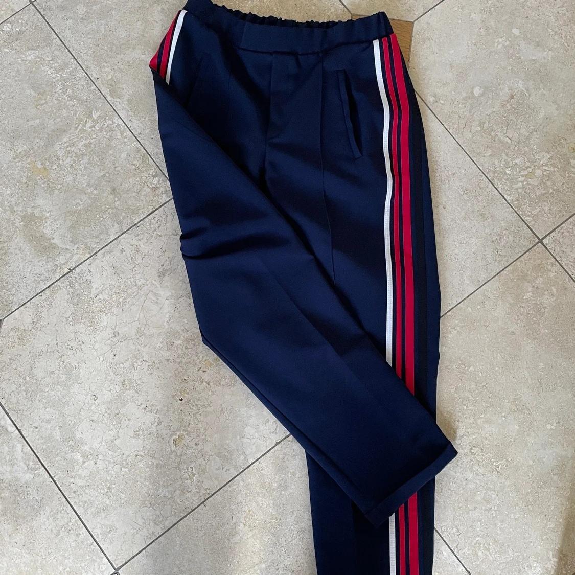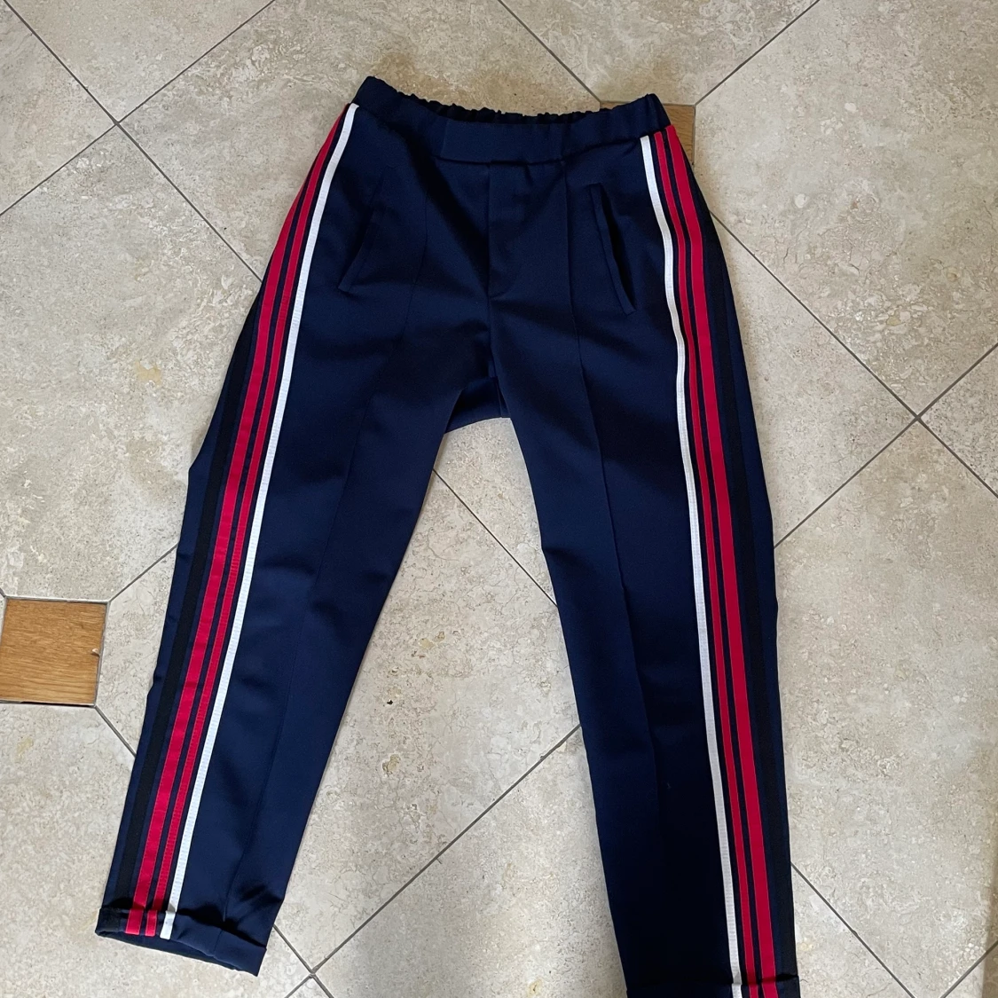 Säljer dessa snygga kostymbyxor från zara då dom tyvärr är för korta på mig som är 174 cm. Det är 4 linjer på båda sidorna (ett svart, två röda och ett vitt). Mycket bra skick och bekvämt material med fina detaljer Inga slitningar eller defekter.