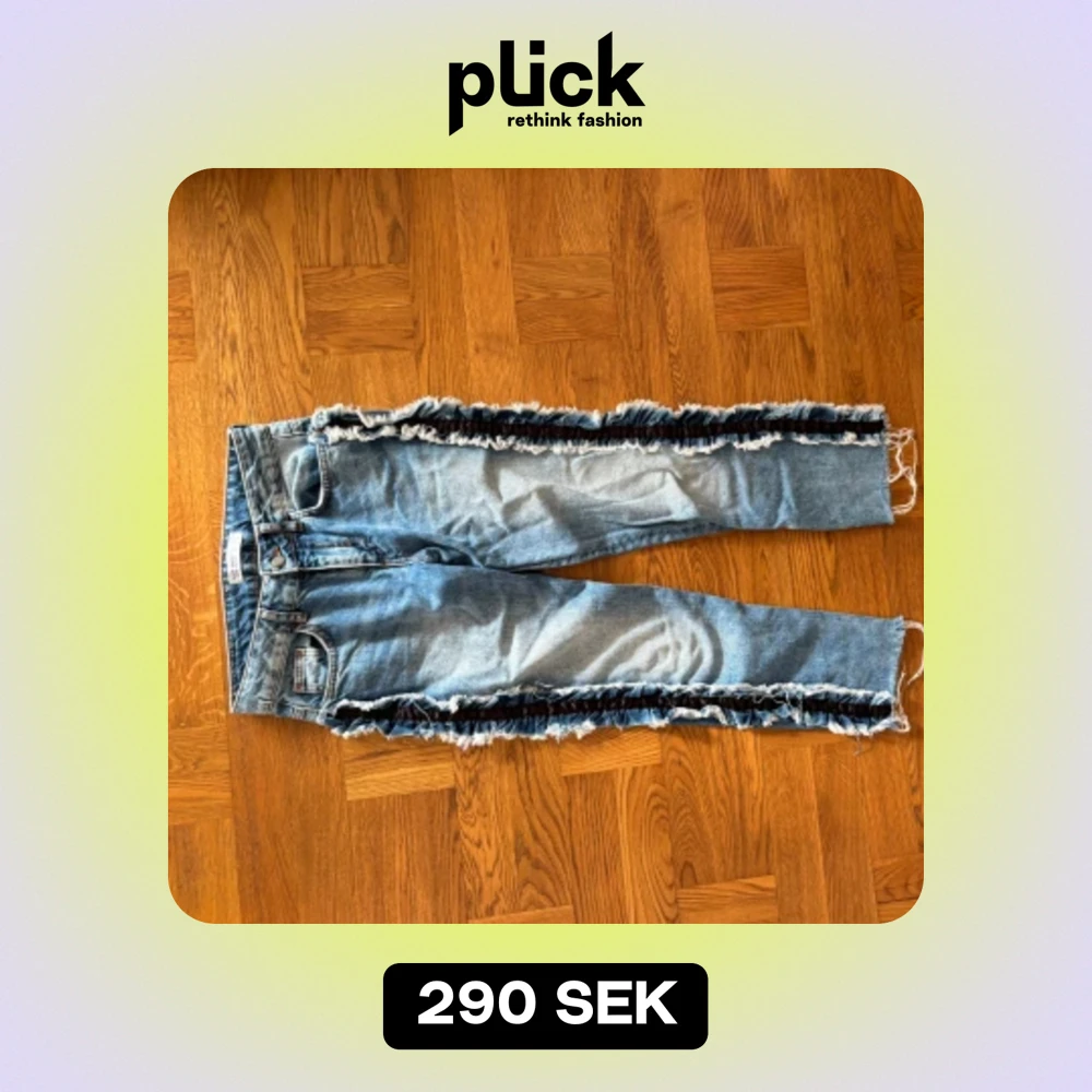 Säljer ett par blå lågmidjade jeans från Zara. De har en cool fransdetalj längs sidorna. De är i fint skick!
