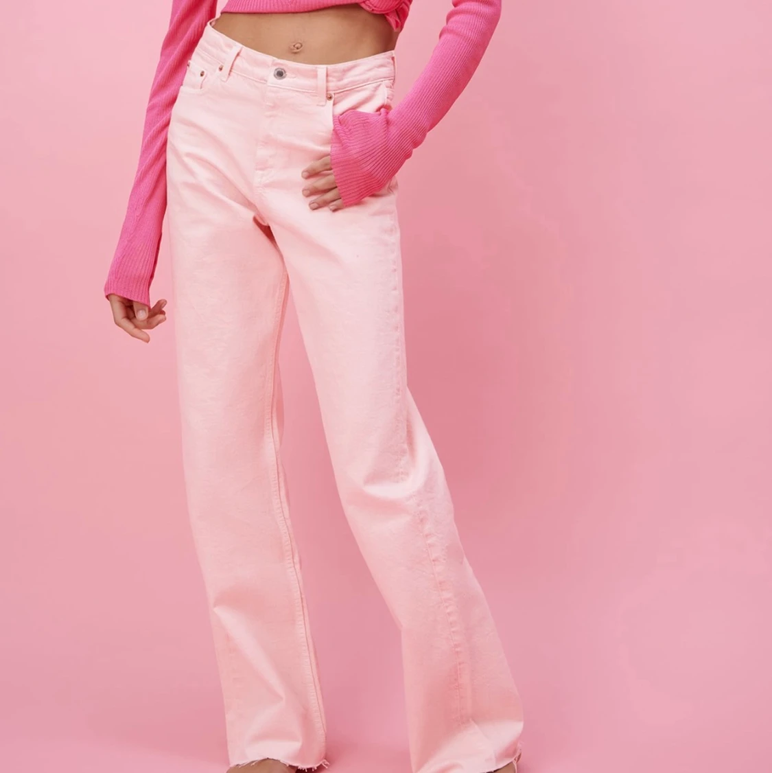 Rosa jeans i stl 36, jag är 166 lång och hur dem ser ut på mig kan man se på andra bilden. Bara använda en gång så i fint skick! Frakt tillkommer🦋. (Finns någon fläck på knät på byxan, därav det billiga priset)
