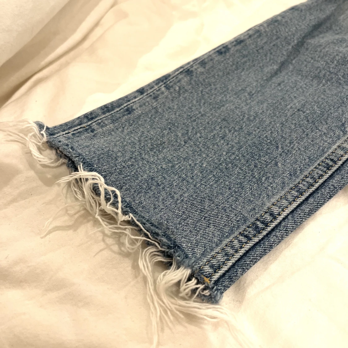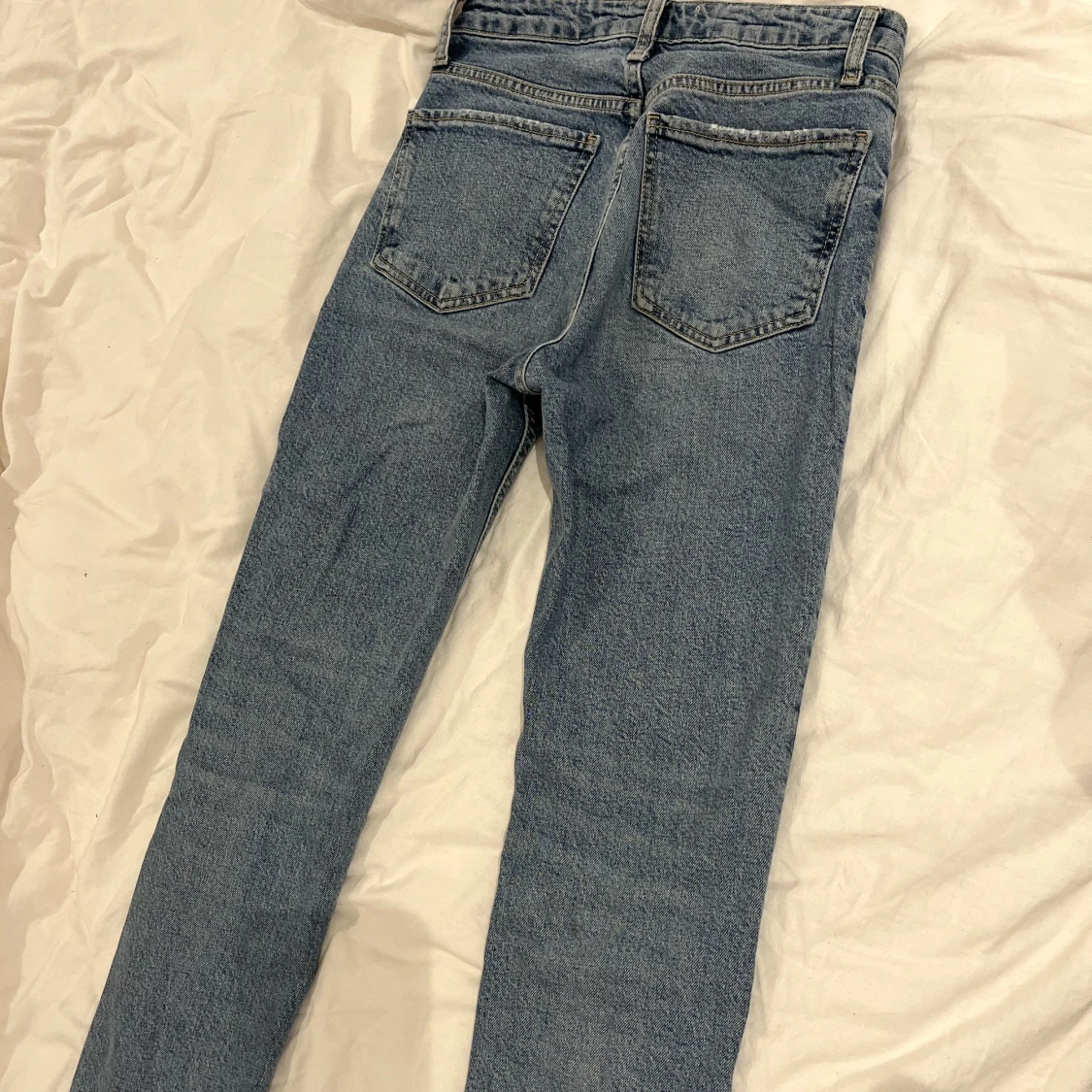 Säljer dessa blåa jeans från zara. Storlek 34. Slitningar/fransar vid byxkanten längst ner