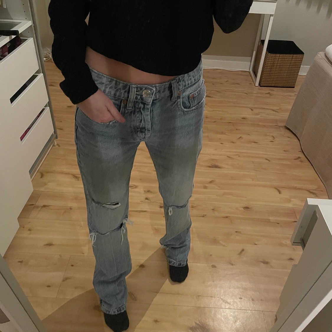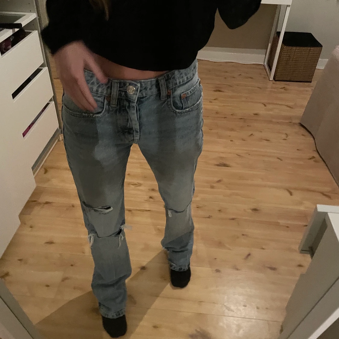 Så snygga Zara jeans som jag knappt har använt, så väldigt fint skick. Fin färg med hål och slitningar i mid rise.