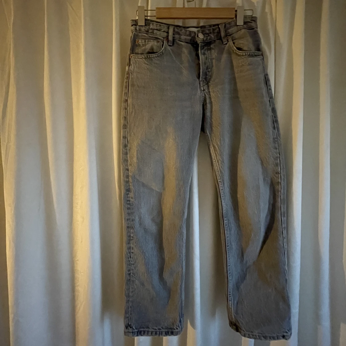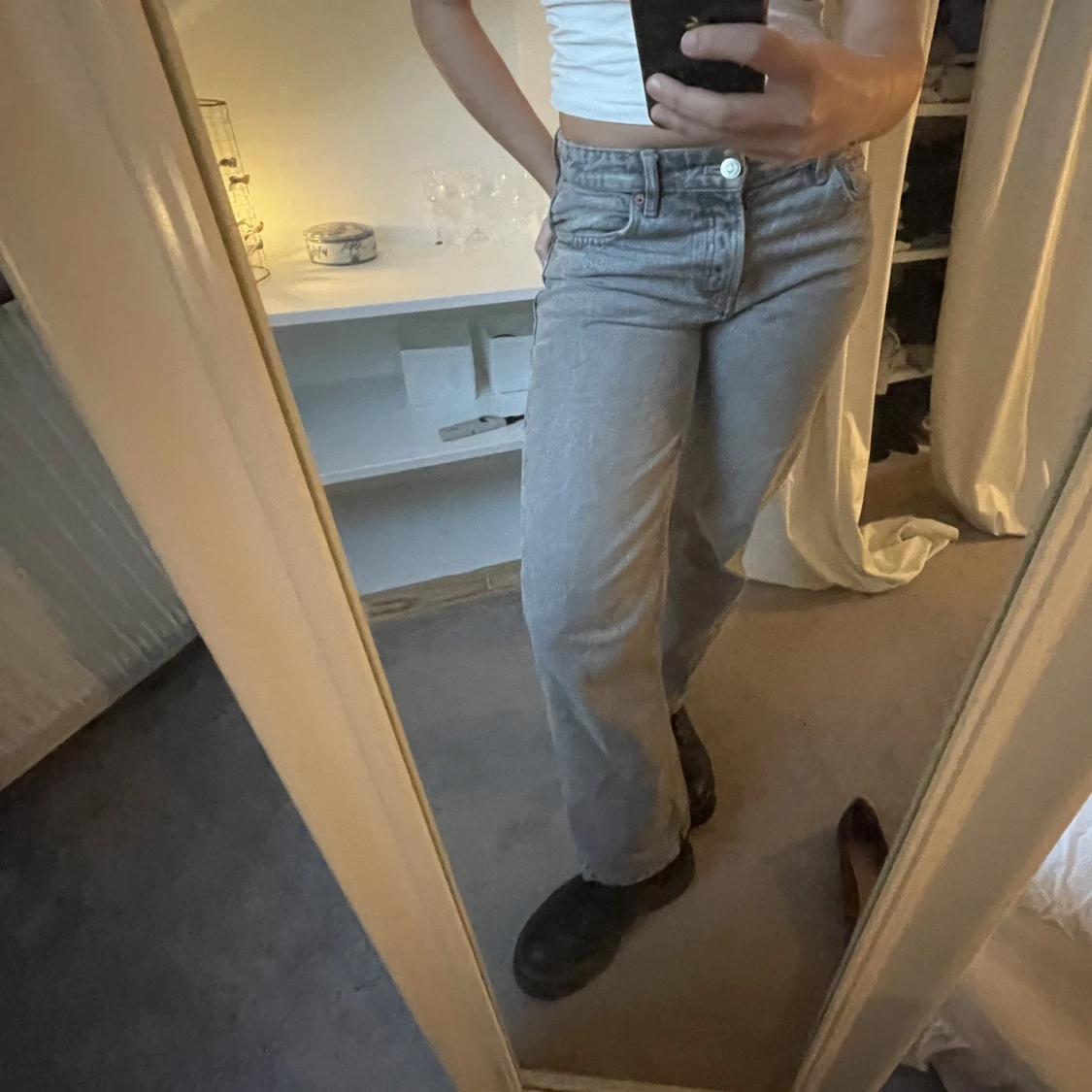 Super fina jeans med riktigt bra passform. Dem är i en härlig tvättat svart färg/nästan grå. Dem är lite korta där nere och så coola!