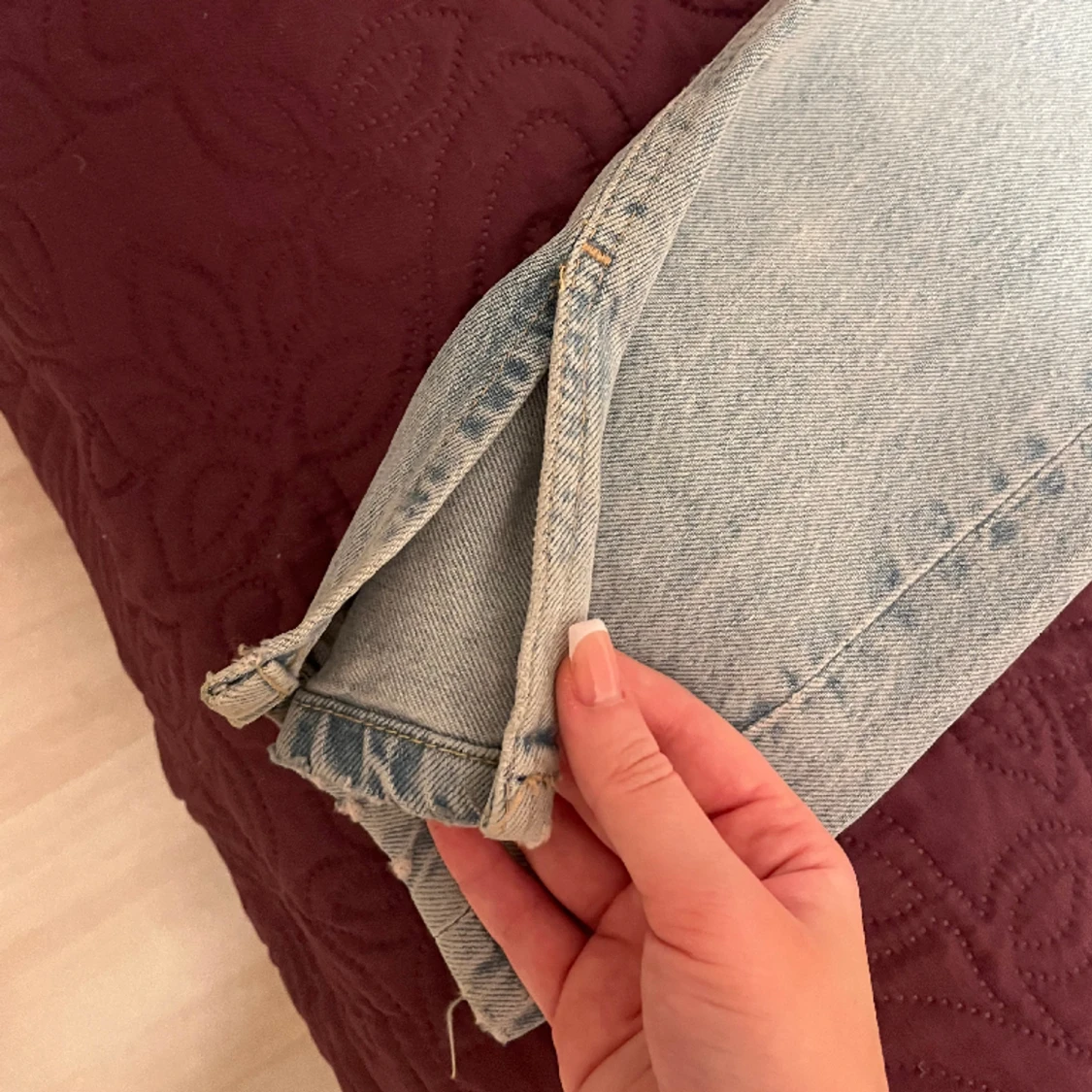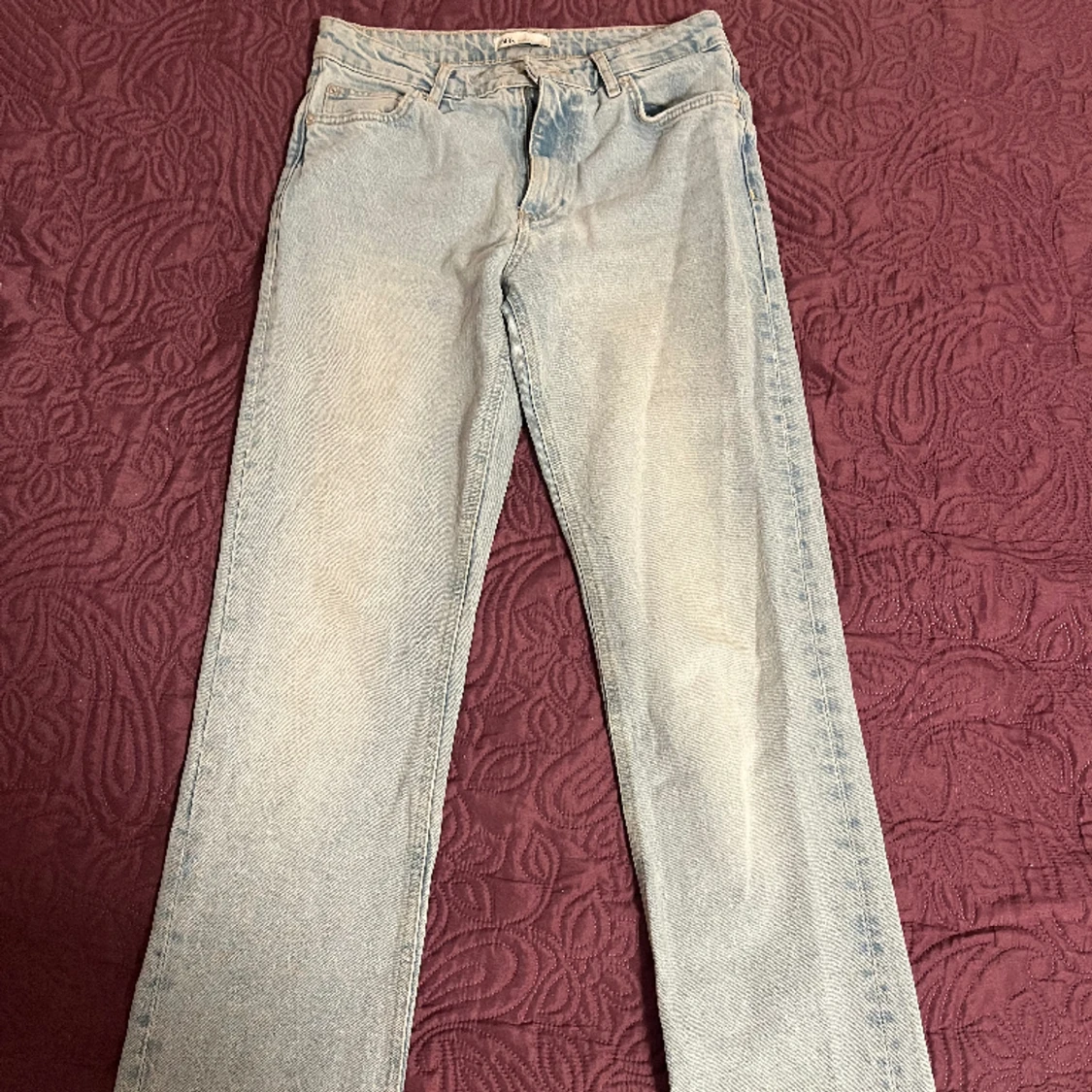 Ljusblåa jeans från zara, slits längst ner och är använda få gånger så de är som nya. Säljs inte längre