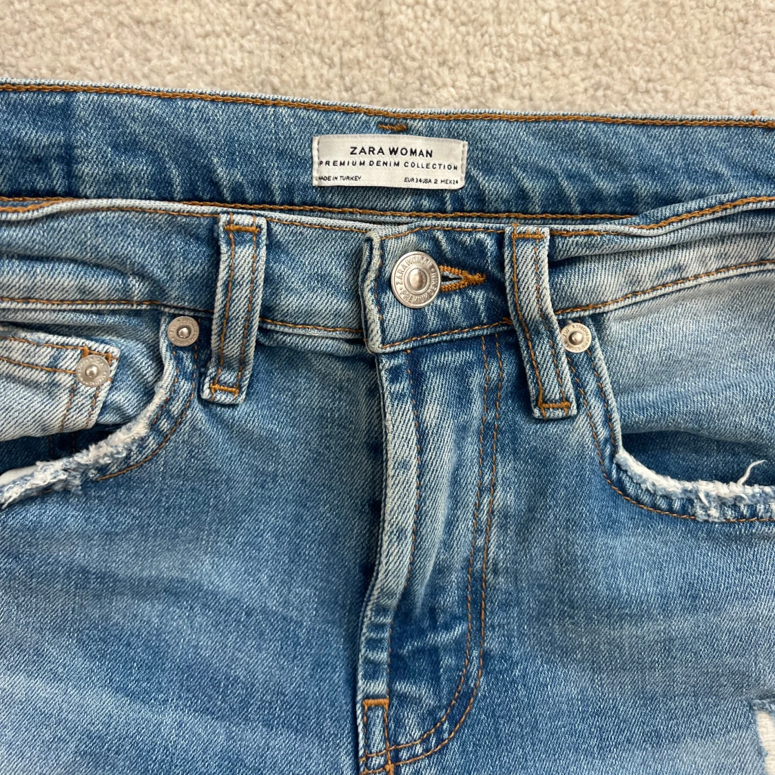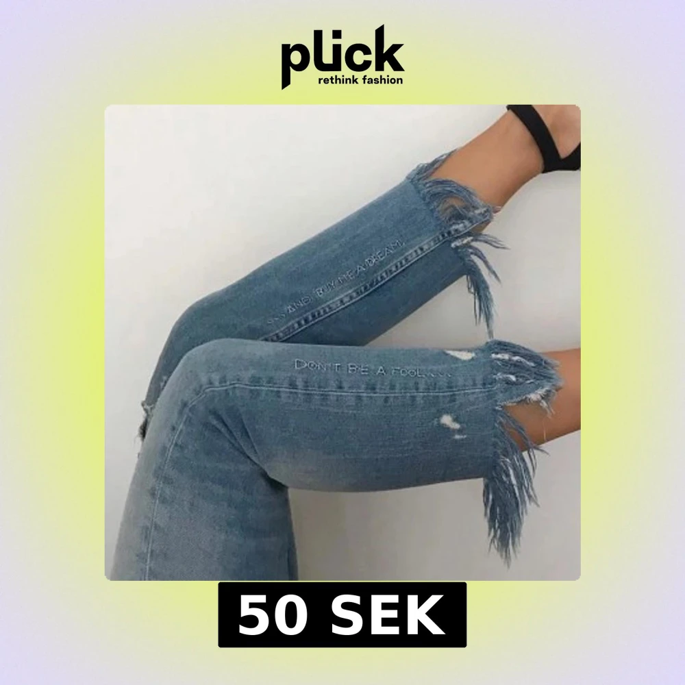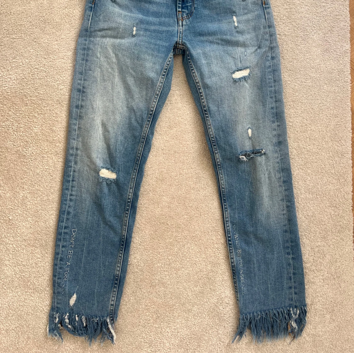 Säljer ett par ljusblå jeans från Zara Woman med fransade benslut och slitna detaljer. Jeansen har broderad text på benen och baktill, samt klassisk femficksdesign och knappgylf. Något lägre i midjan, se bilder