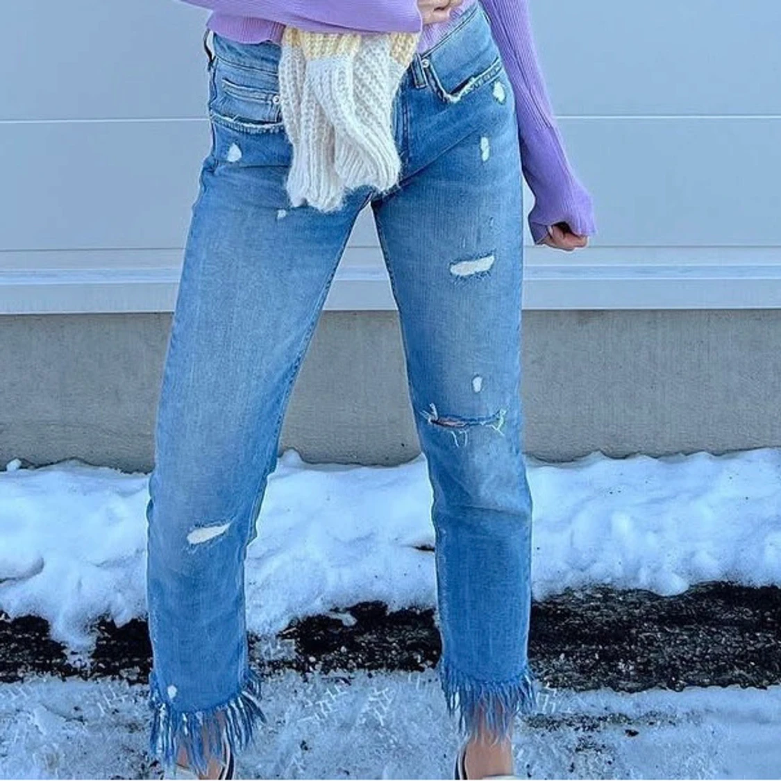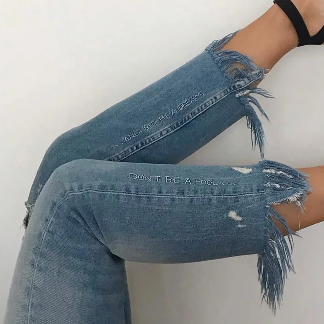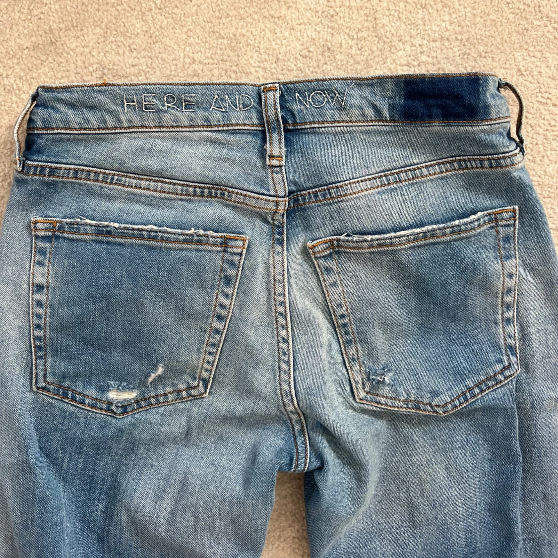 Säljer ett par ljusblå jeans från Zara Woman med fransade benslut och slitna detaljer. Jeansen har broderad text på benen och baktill, samt klassisk femficksdesign och knappgylf. Något lägre i midjan, se bilder