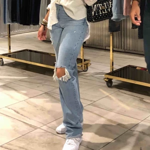 Raka supersnygga blåa jeans från zara med hål på knäna i storlek 36! Kommer tyvärr inte till användning längre ;( Första och andra bilderna är mina, sista lånad