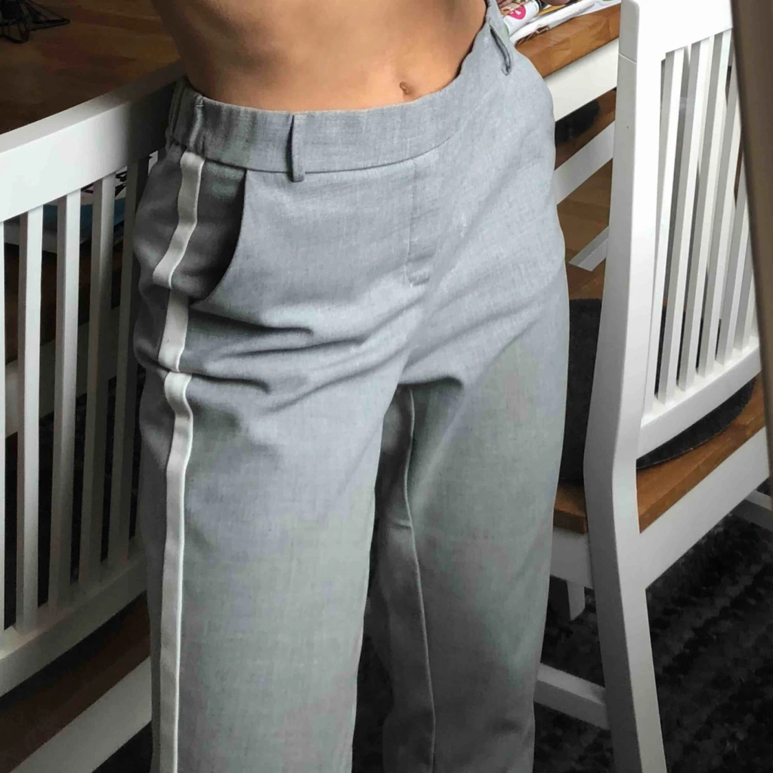 Grå ”kostymbyxor” i mjukt material med vit revär på sidan. I storlek XS men kan passa även en S om man vill ha dem tightare. Använda några gånger men i fint skick, så gott som nytt!