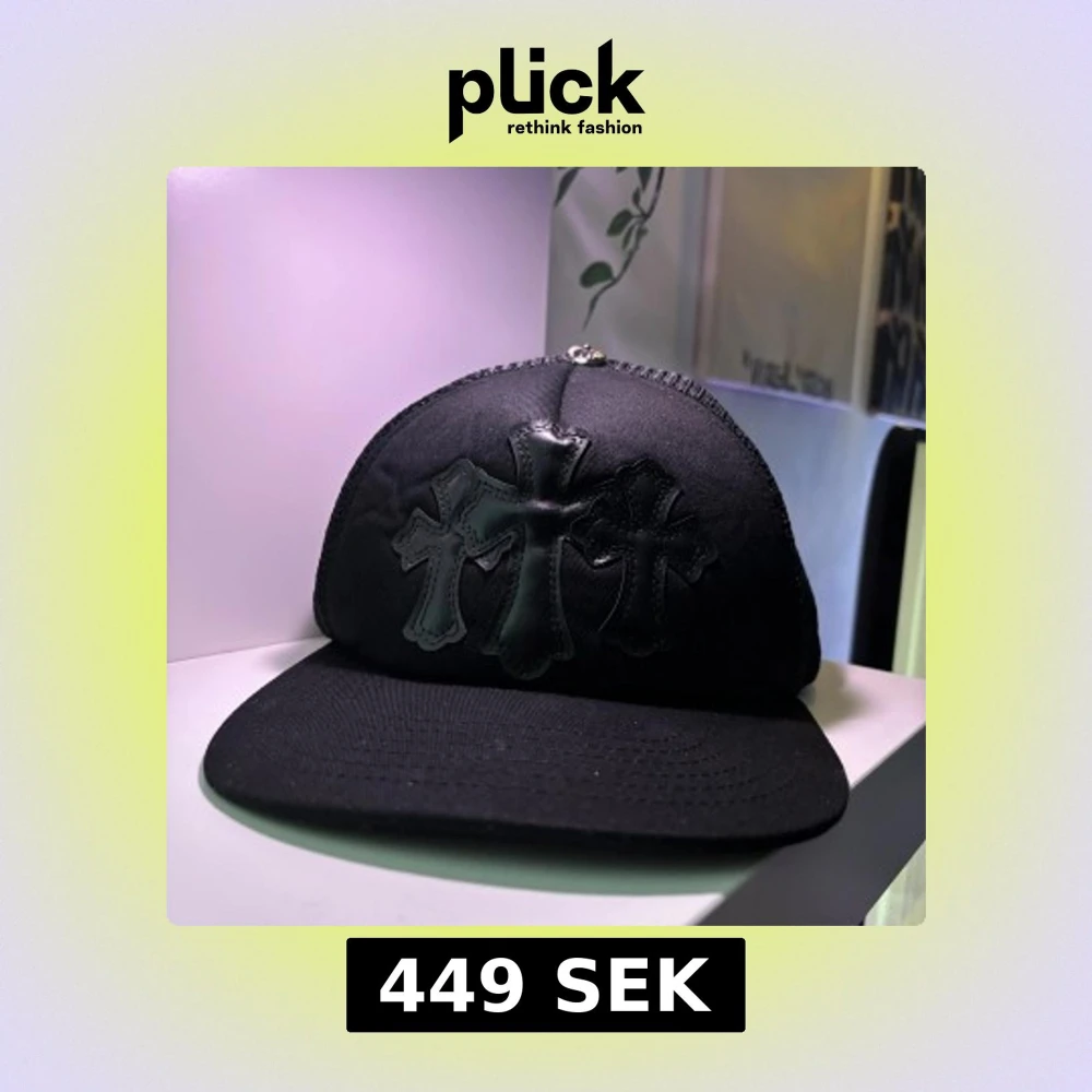 Säljer en svart keps från Chrome Hearts med tre svarta kors i läder framtill och broderad logga bak. Kepsen har böjd skärm och justerbar snapback. Materialet är en mix av tyg och mesh för skön ventilation.