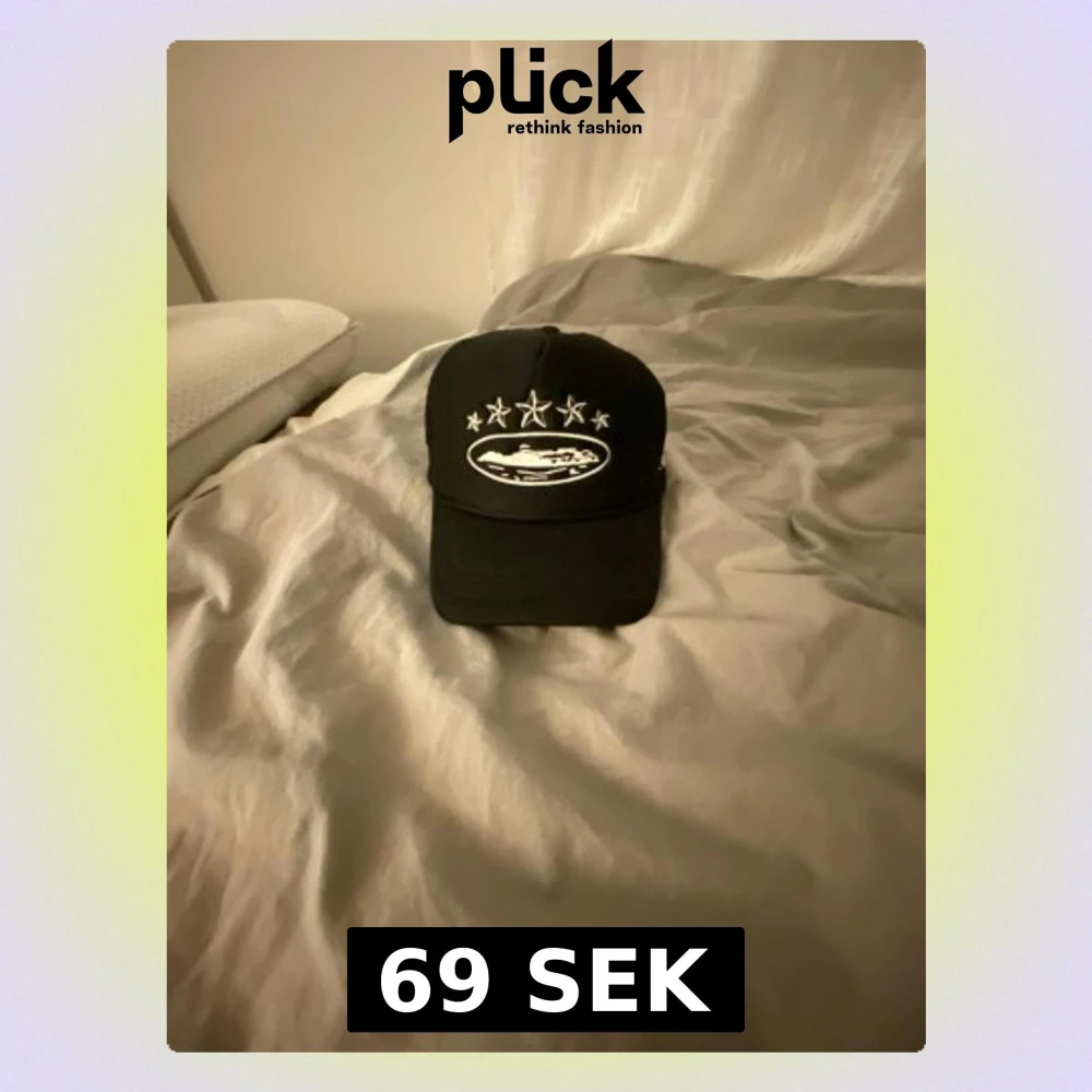 Svart truckerkeps med vit brodyr framtill som visar fem stjärnor och ett motiv av en bil. Kepsen har mesh på sidorna och bak för extra ventilation samt justerbar snapback. Perfekt för dig som gillar streetwear och coola accessoarer.