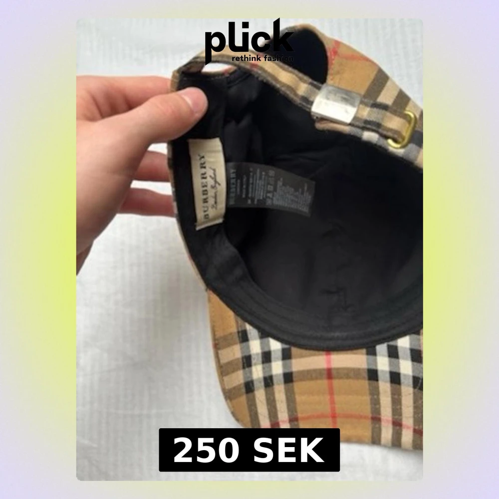 Säljer en klassisk keps från Burberry i det ikoniska beige rutmönstret med svarta, vita och röda detaljer. Kepsen har justerbart spänne i metall baktill och är fodrad med svart tyg på insidan. Perfekt accessoar för en trendig och tidlös look.