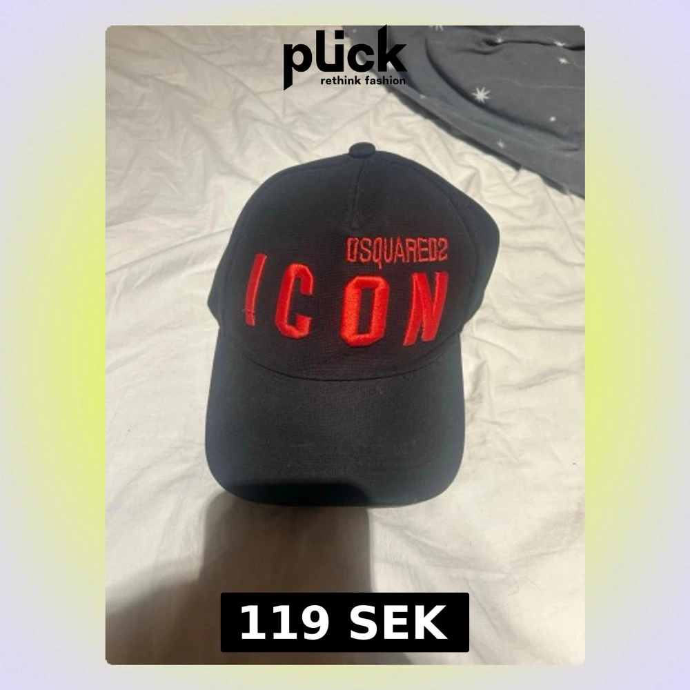 Säljer en svart keps från Dsquared2 med stor röd brodyrtext 'ICON' och Dsquared2-logga framtill. Klassisk böjd skärm och justerbar rem bak. Tillverkad i bomull för en bekväm och snygg look.