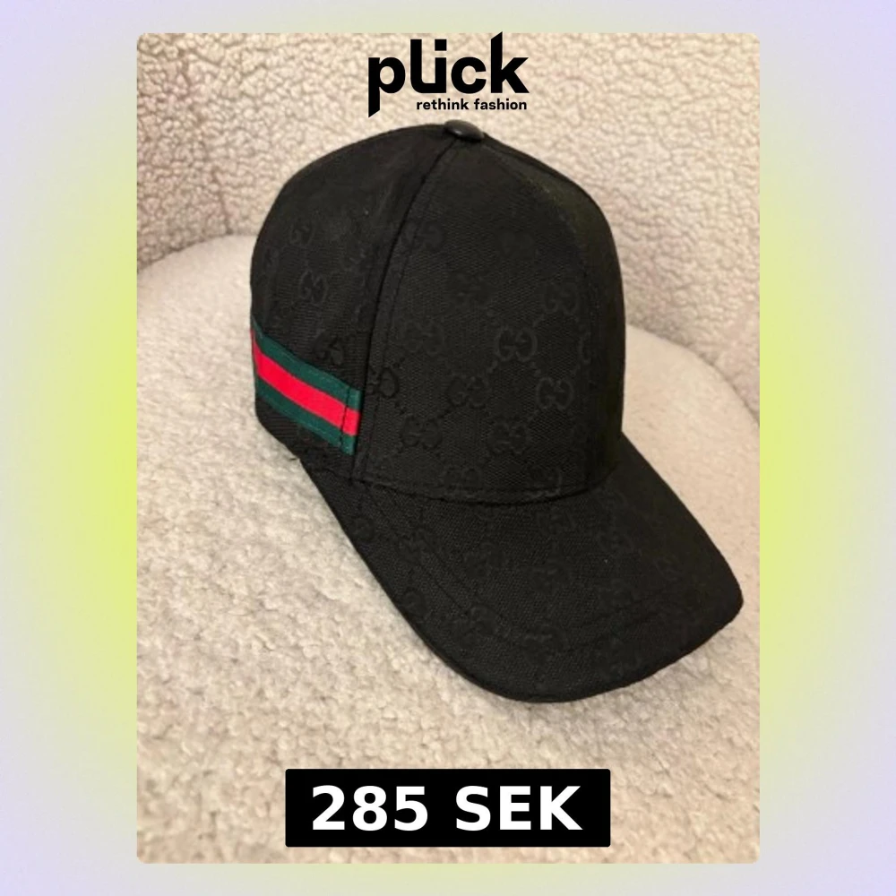 Snygg svart keps från Gucci med diskret GG-monogram över hela tyget. På sidan finns de klassiska gröna och röda ränderna. Kepsen har böjd skärm och är tillverkad i ett slitstarkt tyg som känns exklusivt och trendigt.