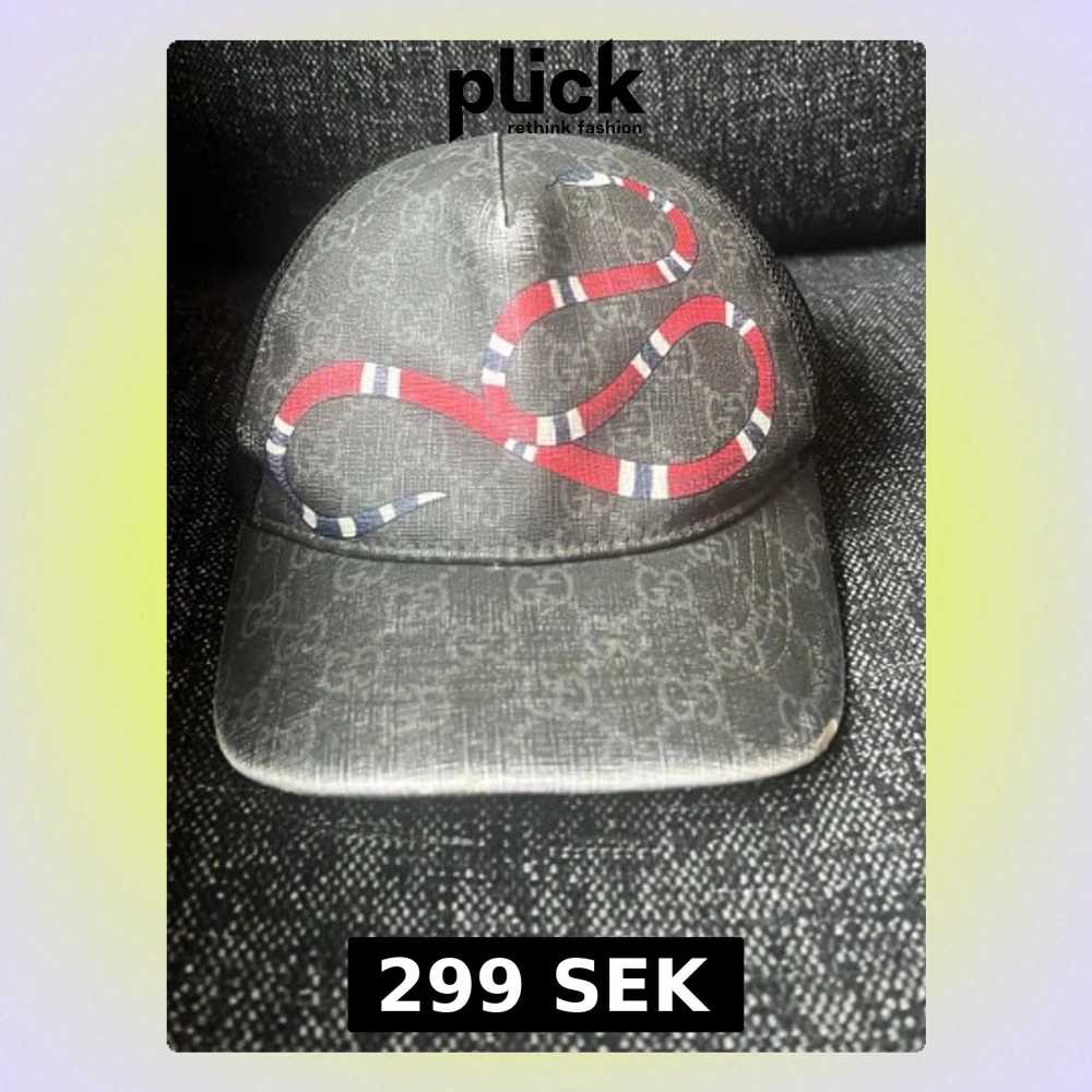 Säljer en svart keps från Gucci med klassiskt GG-mönster och en stor röd, vit och svart orm på framsidan. Kepsen har böjd skärm och justerbar baksida. Materialet är canvas med mesh på sidorna för extra ventilation. Perfekt för dig som vill sticka ut med en unik accessoar.