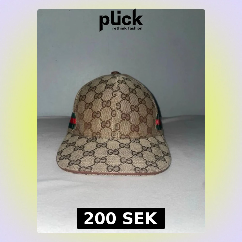 Snygg keps från Gucci i beige och brunt med klassiskt GG-monogram över hela kepsen. Kepsen har böjd skärm och detaljer i grönt och rött på sidorna. Perfekt accessoar för att lyfta din streetwear-look.
