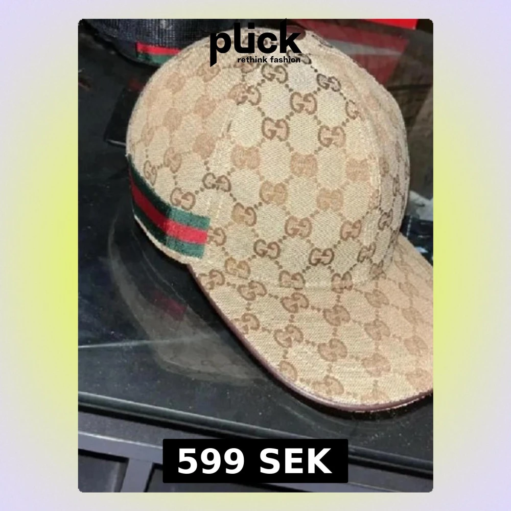 Säljer en beige keps från Gucci med det klassiska GG-monogrammet över hela kepsen. På sidan finns en grön och röd rand som ger en ikonisk touch. Kepsen är tillverkad i canvasmaterial och har böjd skärm. Perfekt för dig som gillar exklusiva accessoarer.