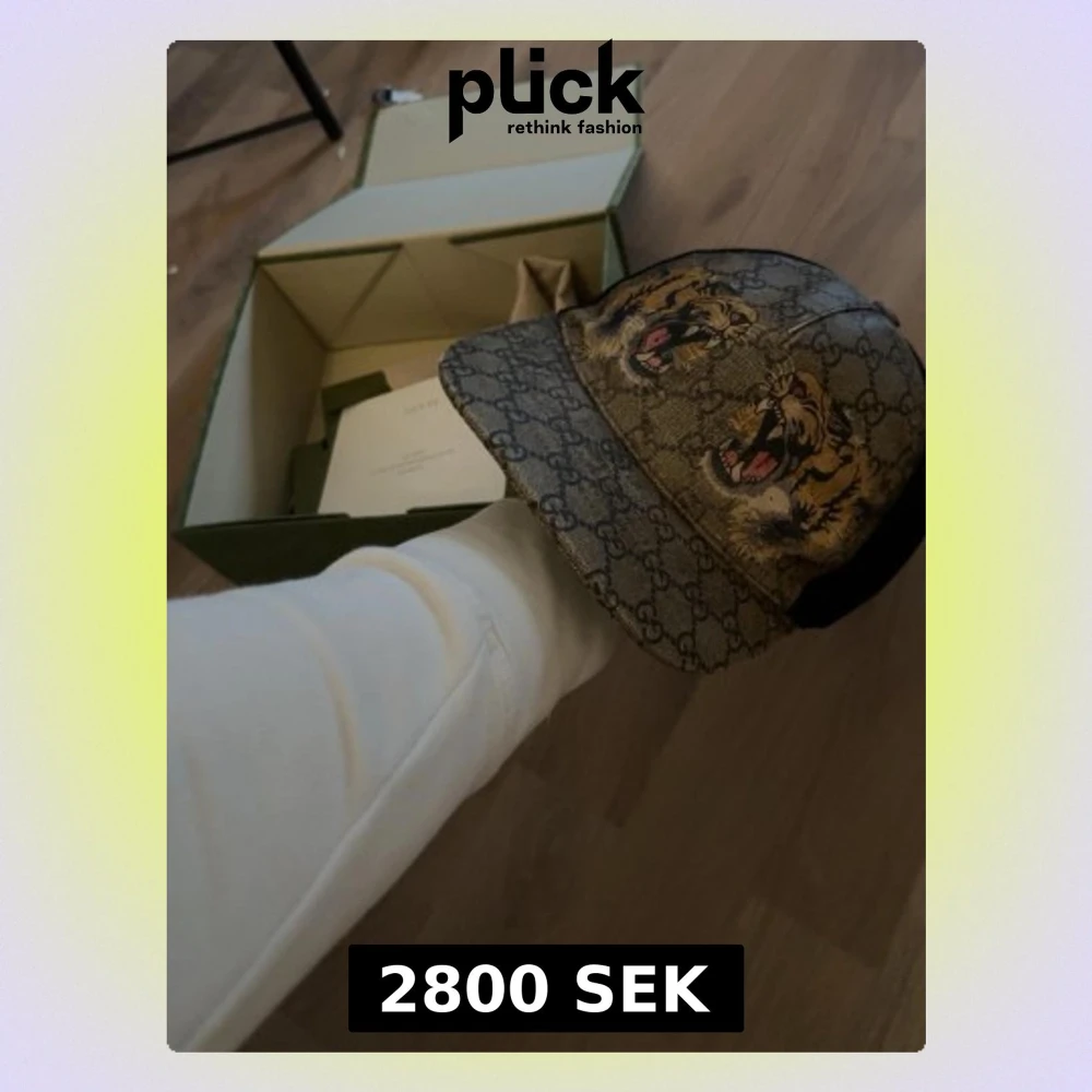 Säljer en snygg Gucci keps i beige/brunt med klassiskt GG-mönster och två stora tigerhuvuden framtill. Kepsen har böjd skärm och justerbar rem bak. Materialet är canvas med detaljer i svart tyg. Perfekt för dig som vill sticka ut med en lyxig accessoar.