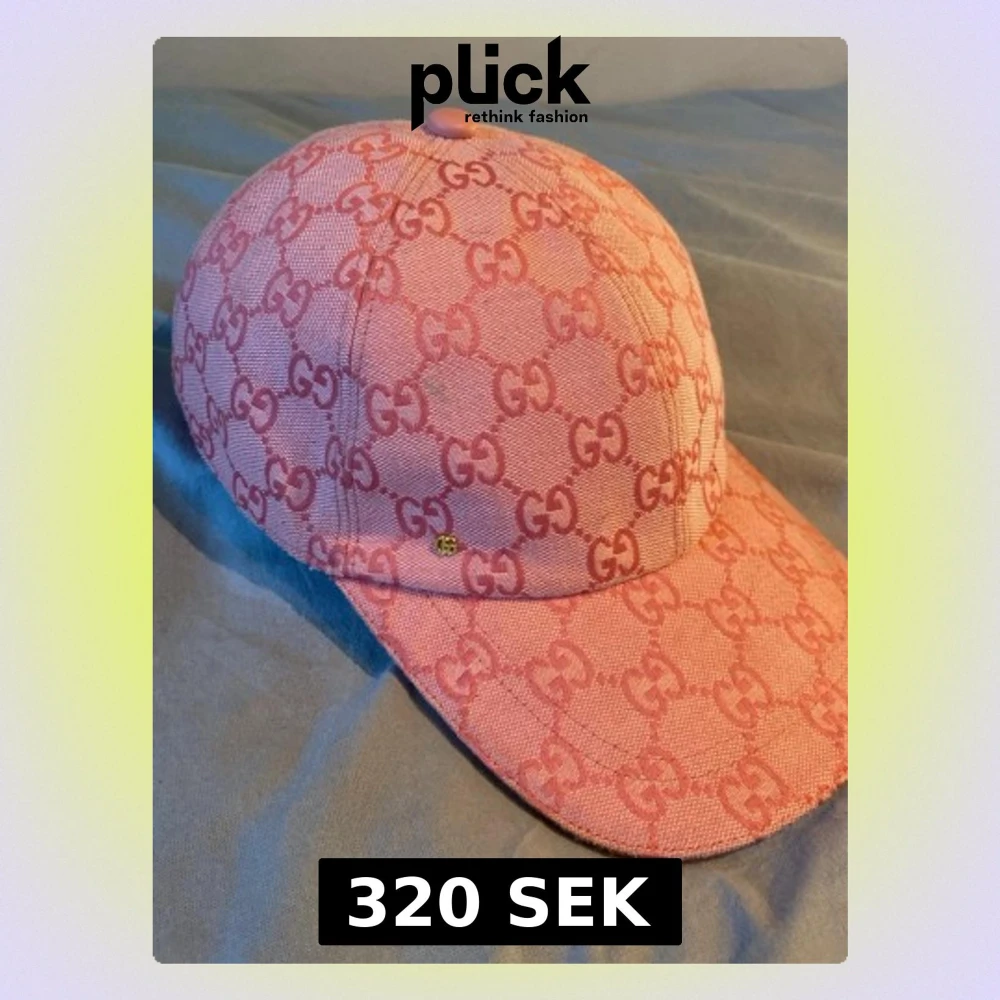 Säljer en snygg rosa keps från Gucci med det klassiska GG-monogrammet över hela kepsen. Kepsen har böjd skärm och knapp på toppen, tillverkad i tyg med exklusiv känsla. Perfekt för dig som vill sticka ut med en trendig accessoar.