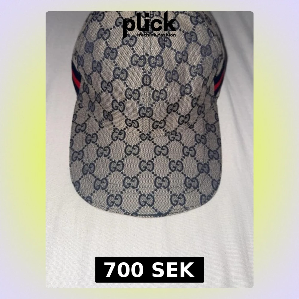 Säljer en beige keps från Gucci med det klassiska GG-monogrammet över hela kepsen. På sidan finns en snygg detalj med blå och röd rand. Kepsen har böjd skärm och är tillverkad i canvasmaterial som ger en exklusiv känsla.
